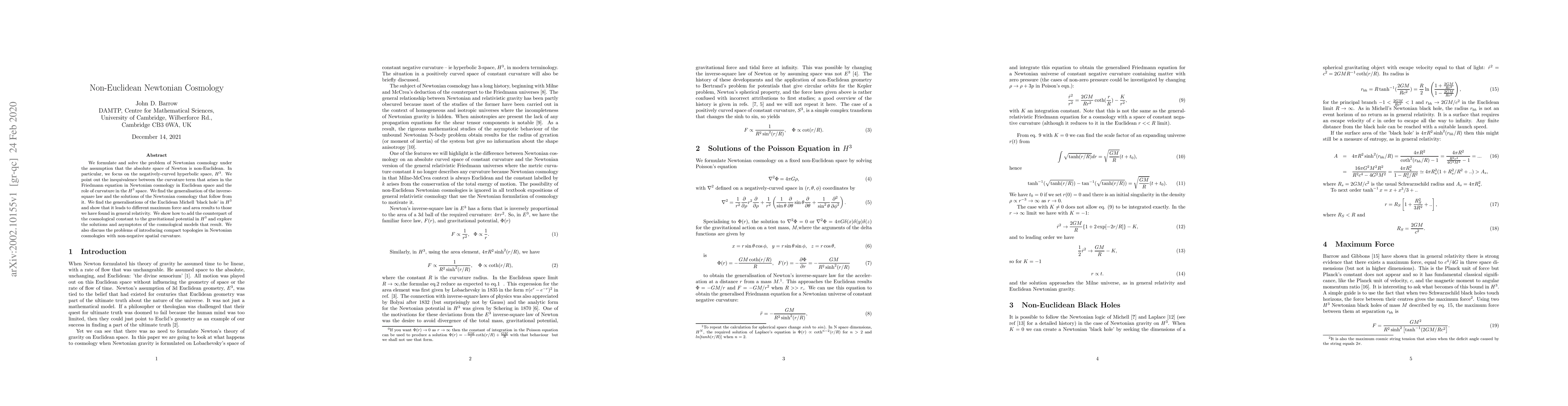 We formulate and solve the problem of Newtonian cosmology under the assumption that the absolute space of Newton is non-Euclidean. In particular, we focus on the negatively-curved hyperbolic space, H3. We point out the inequivalence between the curvature term that arises in the Friedmann equation in Newtonian cosmology in Euclidean space and the role of curvature in the H3 space. We find the generalisation of the inverse-square law and the solutions of the Newtonian cosmology that follow from it. We find the generalisations of the Euclidean Michell 'black hole' in H3 and show that it leads to different maximum force and area results to those we have found in general relativity. We show how to add the counterpart of the cosmological constant to the gravitational potential in H3 and explore the solutions and asymptotes of the cosmological models that result. We also discuss the problems of introducing compact topologies in Newtonian cosmologies with non-negative spatial curvature.