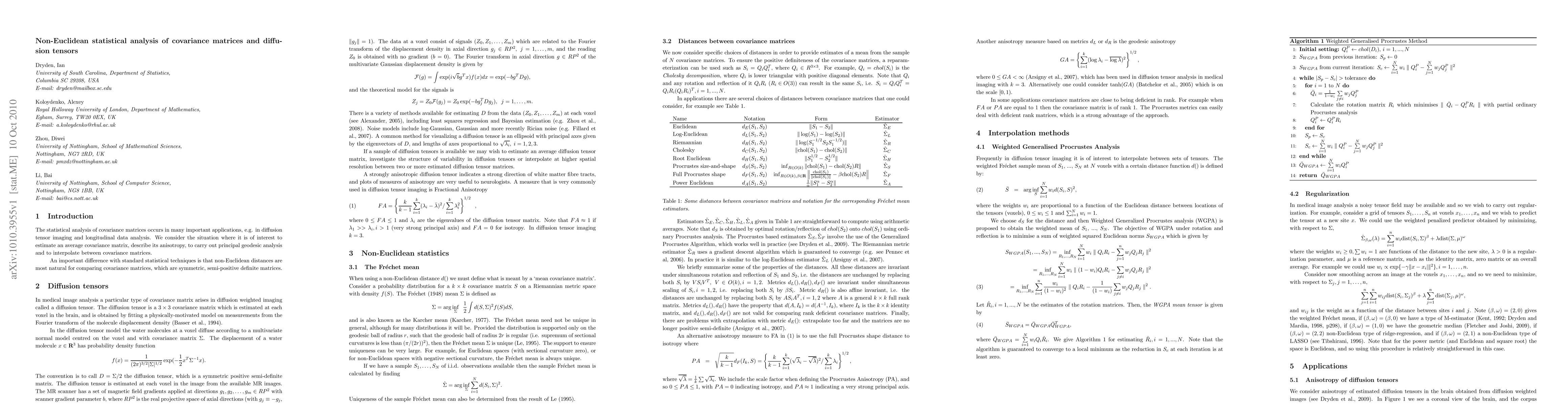 The statistical analysis of covariance matrices occurs in many important applications, e.g. in diffusion tensor imaging and longitudinal data analysis. We consider the situation where it is of interest to estimate an average covariance matrix, describe its anisotropy, to carry out principal geodesic analysis and to interpolate between covariance matrices. There are many choices of metric available, each with its advantages. The particular choice of what is best will depend on the particular application. The use of the Procrustes size-and-shape metric is particularly appropriate when the covariance matrices are close to being deficient in rank. We discuss the use of different metrics for diffusion tensor analysis, and we also introduce certain types of regularization for tensors.