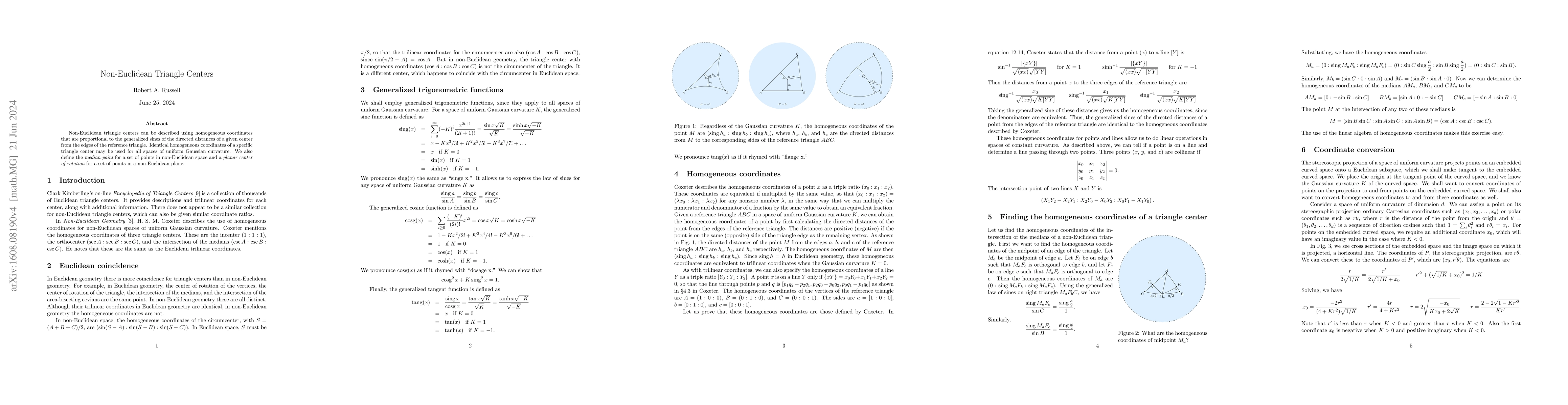 This paper explores non-Euclidean triangle centers defined via homogeneous coordinates proportional to generalized sines of directed distances from triangle edges. It introduces a median point and a planar center of rotation applicable to uniform Gaussian curvature spaces.