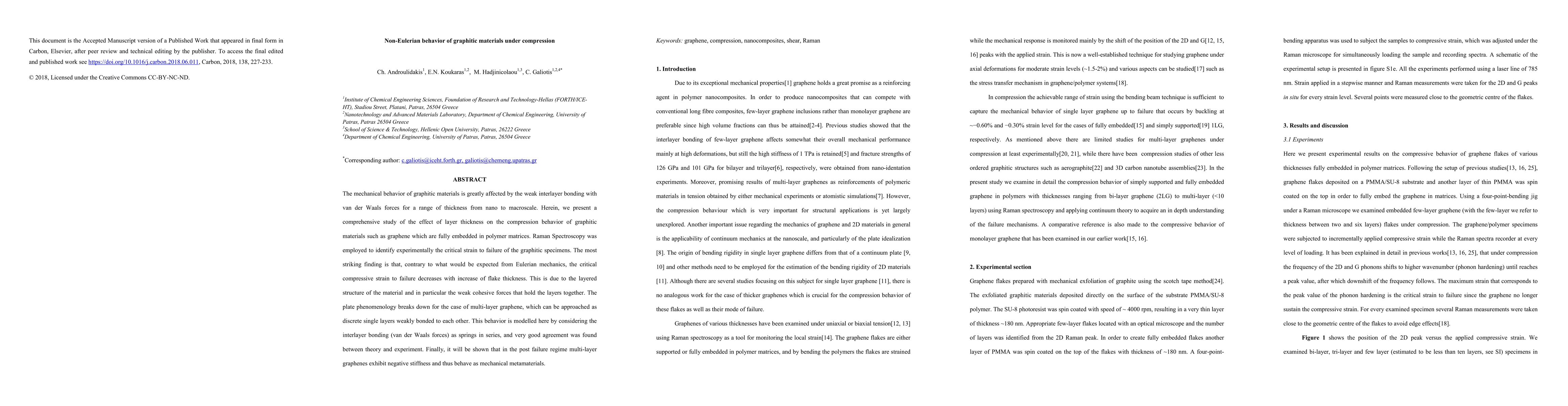 This study investigates the non-Eulerian compression behavior of graphitic materials like graphene embedded in polymer matrices, revealing that the critical strain to failure decreases with increasing flake thickness due to weak interlayer bonding. The research models interlayer bonding as springs in series, showing good agreement between theory and experimental results, and identifies negative stiffness in multi-layer graphene post failure.
