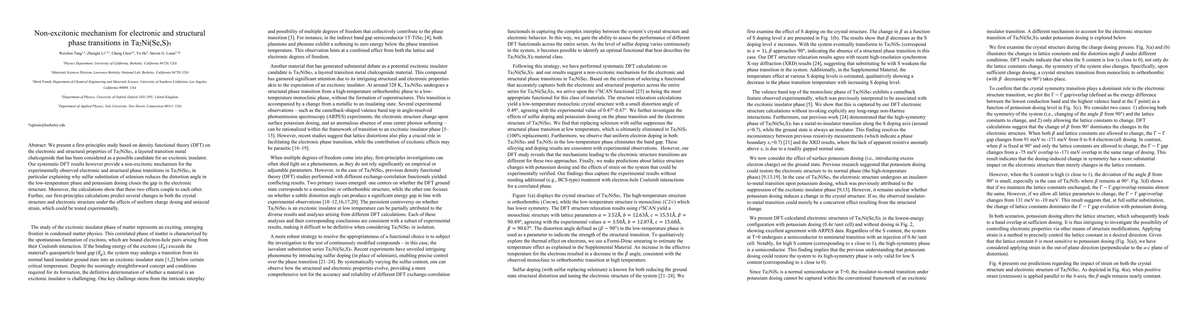 This work differs from previous research by proposing a non-excitonic mechanism for the observed phase transitions in Ta2NiSe5, supported by DFT calculations predicting structural and electronic modifications under charge dosing and strain.