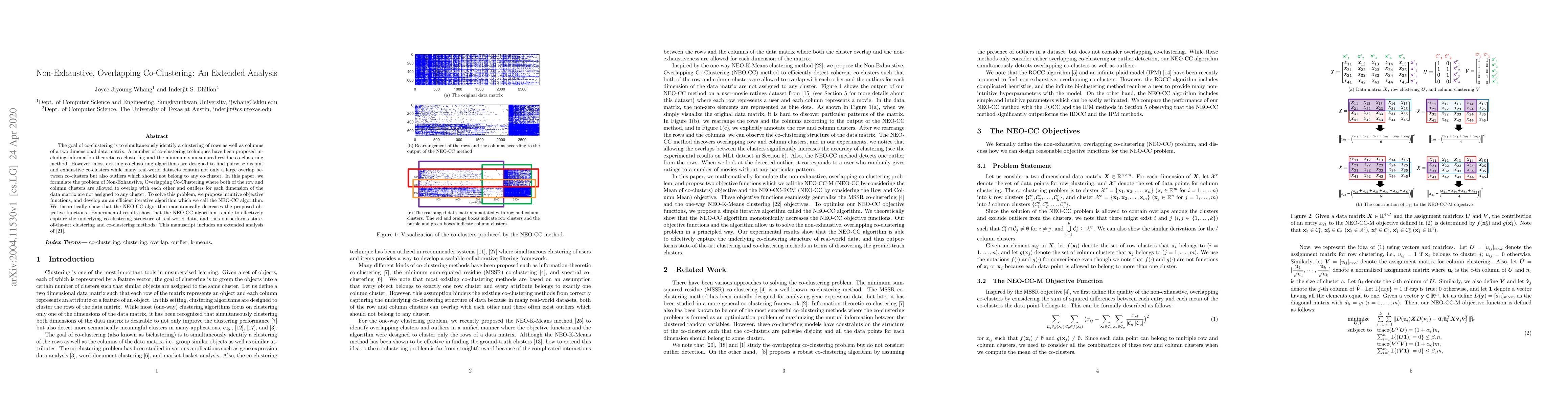 The paper presents the NEO-CC algorithm, which allows for non-exhaustive and overlapping co-clustering, along with theoretical proof of its monotonic decrease in objective functions.