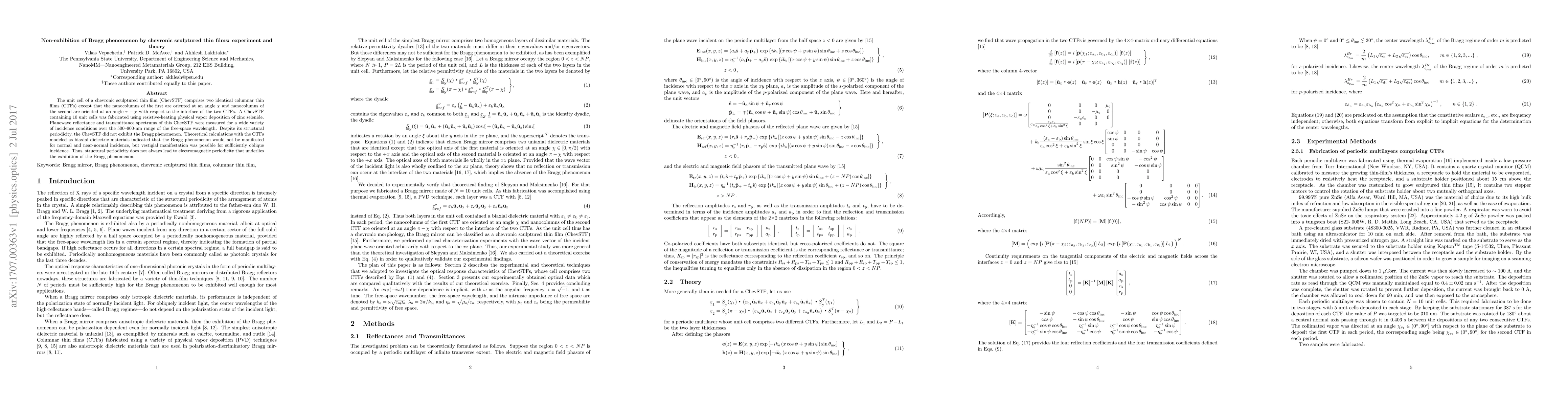 The unit cell of a chevronic sculptured thin film (ChevSTF) comprises two identical columnar thin films (CTFs) except that the nanocolumns of the first are oriented at an angle \chi and nanocolumns of the second are oriented at an angle \pi-\chi with respect to the interface of the two CTFs. A ChevSTF containing 10 unit cells was fabricated using resistive-heating physical vapor deposition of zinc selenide. Planewave reflectance and transmittance spectrums of this ChevSTF were measured for a wide variety of incidence conditions over the 500--900-nm range of the free-space wavelength. Despite its structural periodicity, the ChevSTF did not exhibit the Bragg phenomenon. Theoretical calculations with the CTFs modeled as biaxial dielectric materials indicated that the Bragg phenomenon would not be manifested for normal and near-normal incidence, but vestigial manifestation was possible for suffciently oblique incidence. Thus, structural periodicity does not always lead to electromagnetic periodicity that underlies the exhibition of the Bragg phenomenon.