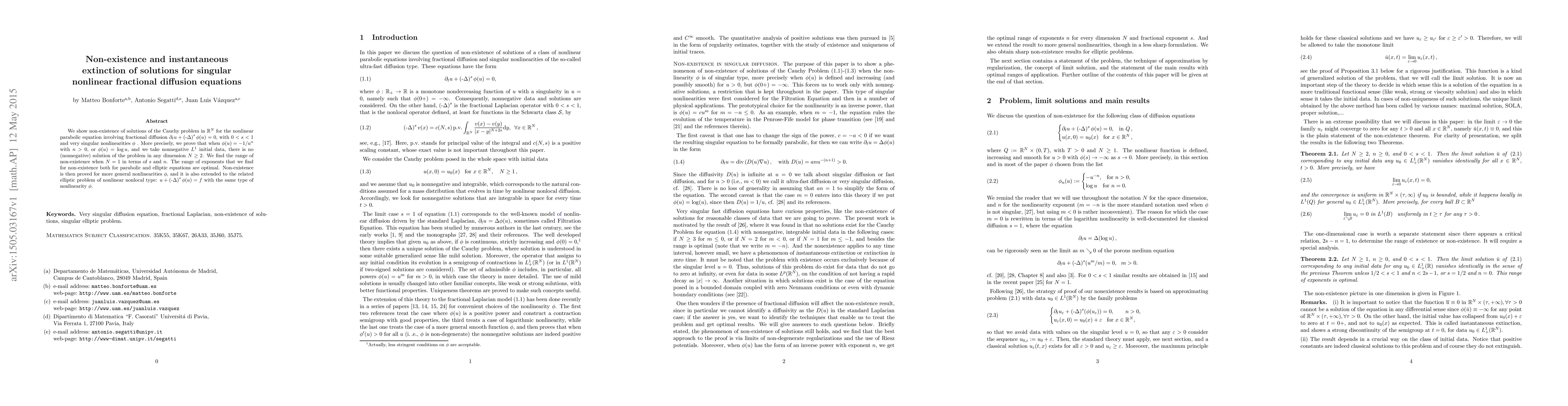 This paper demonstrates the non-existence of nonnegative solutions for a nonlinear fractional diffusion equation with singular nonlinearities, specifically when $\phi(u)=-1/u^n$ or $\phi(u) = \log u$. The authors show that no solutions exist for initial data in $L^1$ and provide optimal ranges for non-existence in various dimensions.