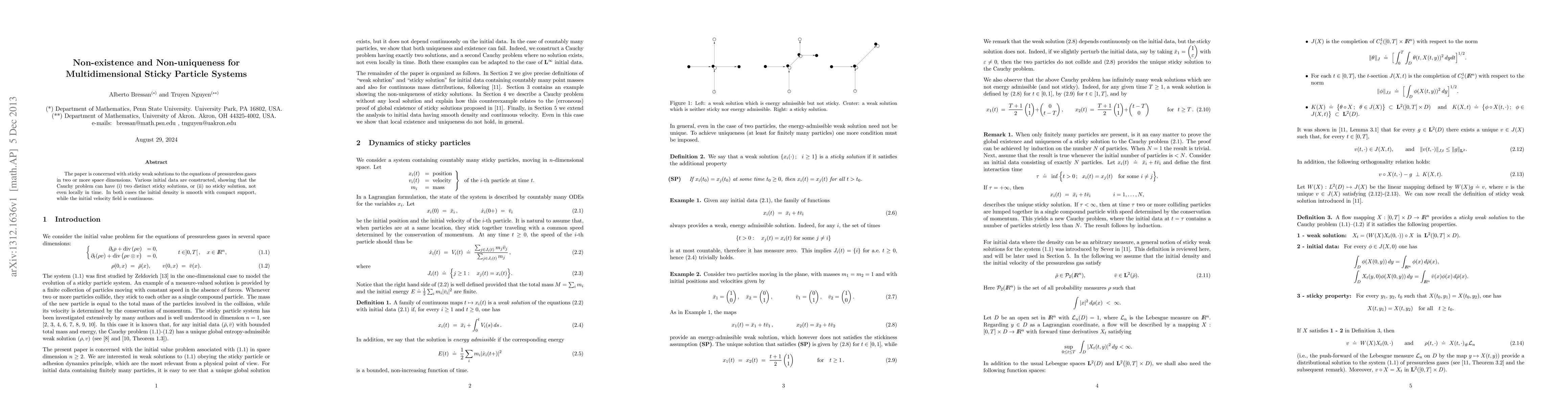 A research paper finds that initial conditions for pressureless gases in multiple dimensions can lead to either two distinct solutions or no solution at all, even when the initial density is smooth and the velocity field is continuous.