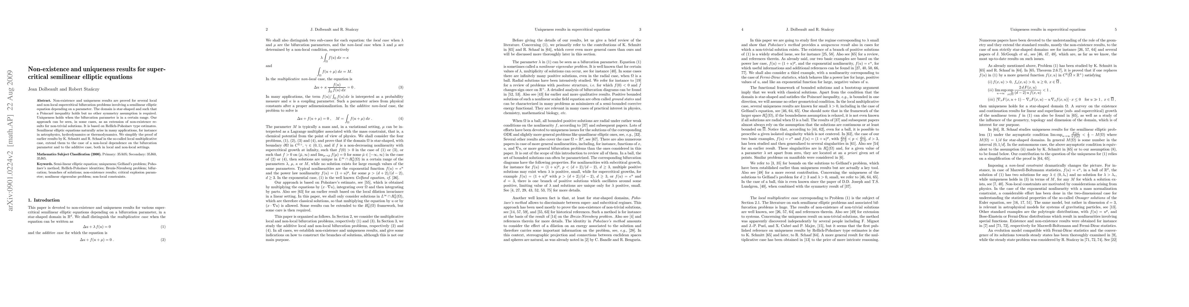 This paper proves non-existence and uniqueness results for supercritical bifurcation problems in semilinear elliptic equations, extending earlier work by K. Schmitt and R. Schaaf. The approach utilizes Rellich-Pohozaev type estimates, simplifying and extending previous results to both local and non-local settings.