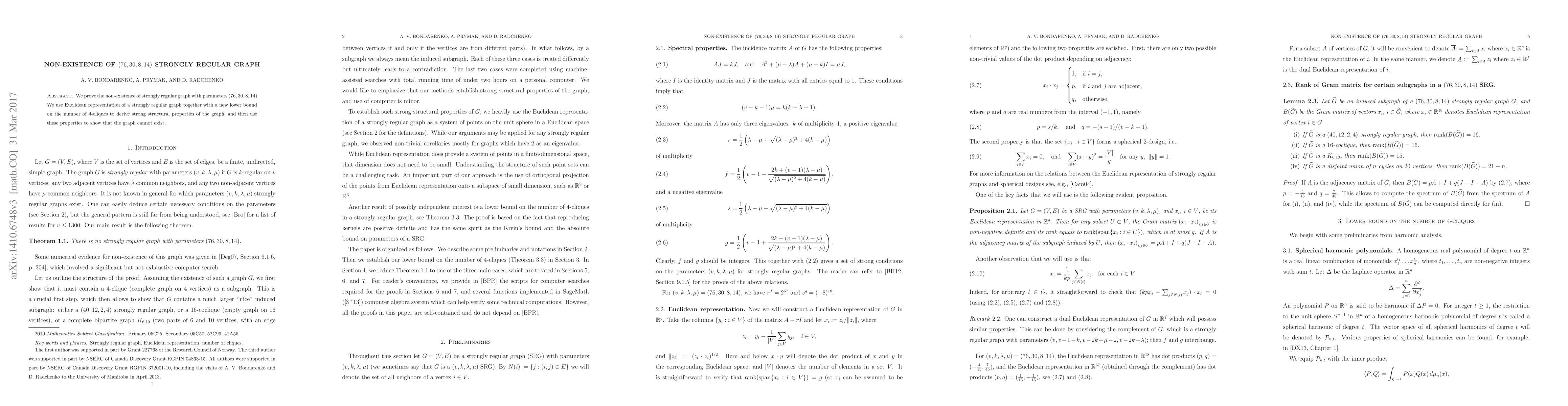 We prove the non-existence of strongly regular graph with parameters $(76,30,8,14)$. We use Euclidean representation of a strongly regular graph together with a new lower bound on the number of 4-cliques to derive strong structural properties of the graph, and then use these properties to show that the graph cannot exist.