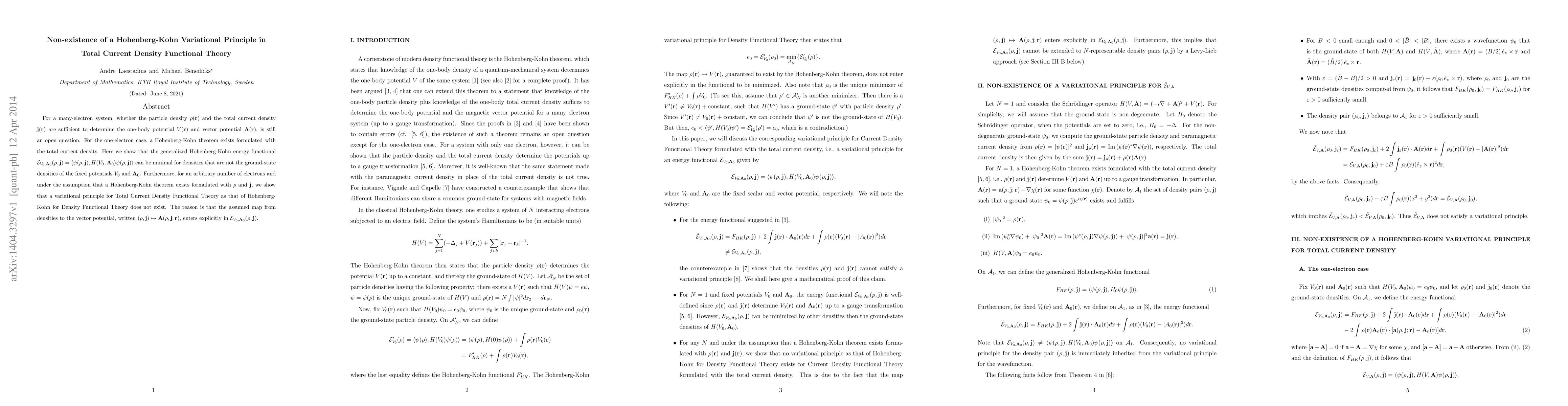 For a many-electron system, whether the particle density $\rho(\mathbf{r})$ and the total current density $\mathbf{j}(\mathbf{r})$ are sufficient to determine the one-body potential $V(\mathbf{r})$ and vector potential $\mathbf{A}(\mathbf{r})$, is still an open question. For the one-electron case, a Hohenberg-Kohn theorem exists formulated with the total current density. Here we show that the generalized Hohenberg-Kohn energy functional $\mathord{\cal E}_{V_0,\mathbf{A}_0}(\rho,\mathbf{j}) = \langle \psi(\rho,\mathbf{j}),H(V_0,\mathbf{A}_0)\psi(\rho,\mathbf{j})\rangle$ can be minimal for densities that are not the ground-state densities of the fixed potentials $V_0$ and $\mathbf{A}_0$. Furthermore, for an arbitrary number of electrons and under the assumption that a Hohenberg-Kohn theorem exists formulated with $\rho$ and $\mathbf{j}$, we show that a variational principle for Total Current Density Functional Theory as that of Hohenberg-Kohn for Density Functional Theory does not exist. The reason is that the assumed map from densities to the vector potential, written $(\rho,\mathbf{j})\mapsto \mathbf{A}(\rho,\mathbf{j};\mathbf{r})$, enters explicitly in $\mathord{\cal E}_{V_0,\mathbf{A}_0}(\rho,\mathbf{j})$.
