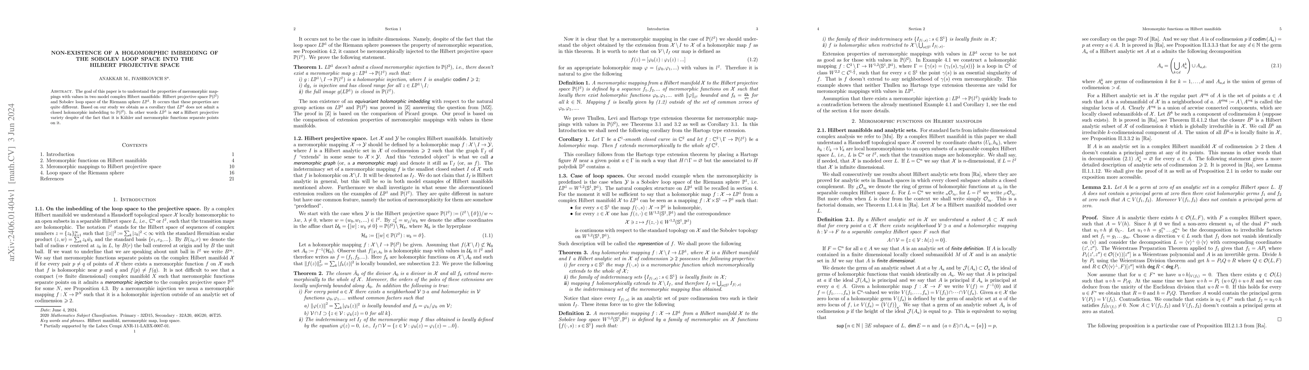 The goal of this paper is to understand the properties of meromorphic mappings with values in two model complex Hibert manifolds: Hilbert projective space $\pp(l^2)$ and Sobolev loop space of the Riemann sphere $L\pp^1$. It occurs that these properties are quite different. Based on our study we obtain as a corollary that $L\pp^1$ does not admit a closed holomorphic imbedding to $\pp(l^2)$. In other words $L\pp^1$ is {\slsf not} a Hilbert projective variety despite of the fact that it is K\"ahler and meromorphic functions separate points on it.