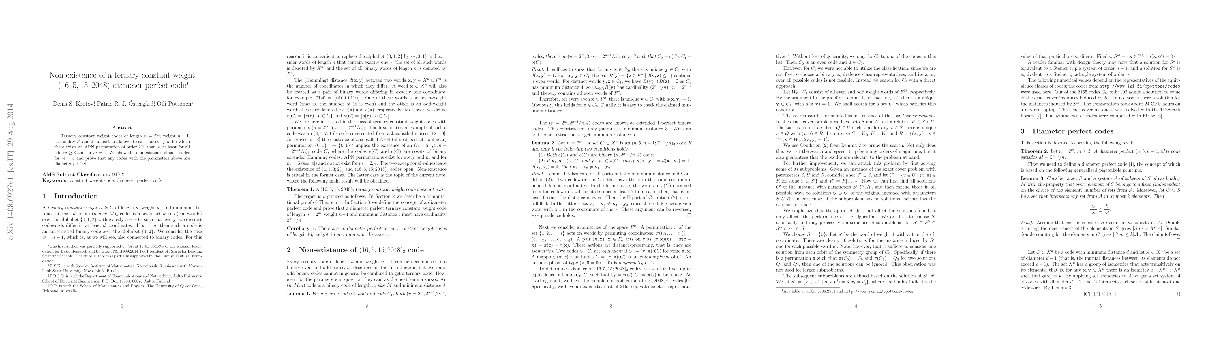 This paper demonstrates the non-existence of a ternary constant weight $(16, 5, 15; 2048)$ diameter perfect code for $m=4$, while confirming the existence of such codes for other specified values of $m$. It also proves that any codes with these parameters are diameter perfect.