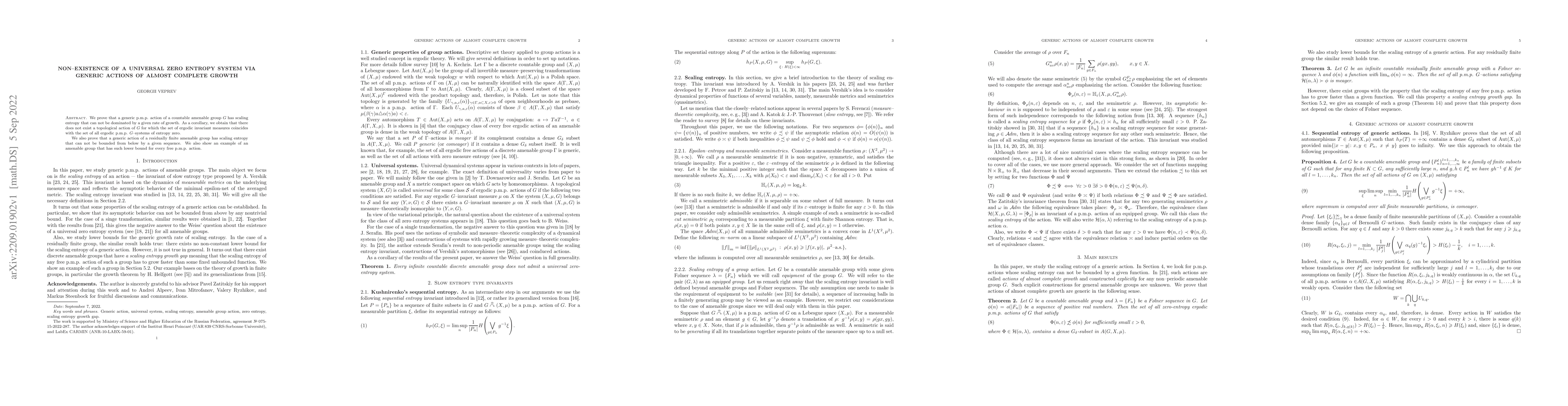 Summary: The paper demonstrates that generic p.m.p. actions of countable amenable groups cannot have scaling entropy dominated by a specified growth rate, leading to the conclusion that no universal zero entropy system exists. It also shows that generic actions of residually finite amenable groups cannot have their scaling entropy bounded below by a given sequence.