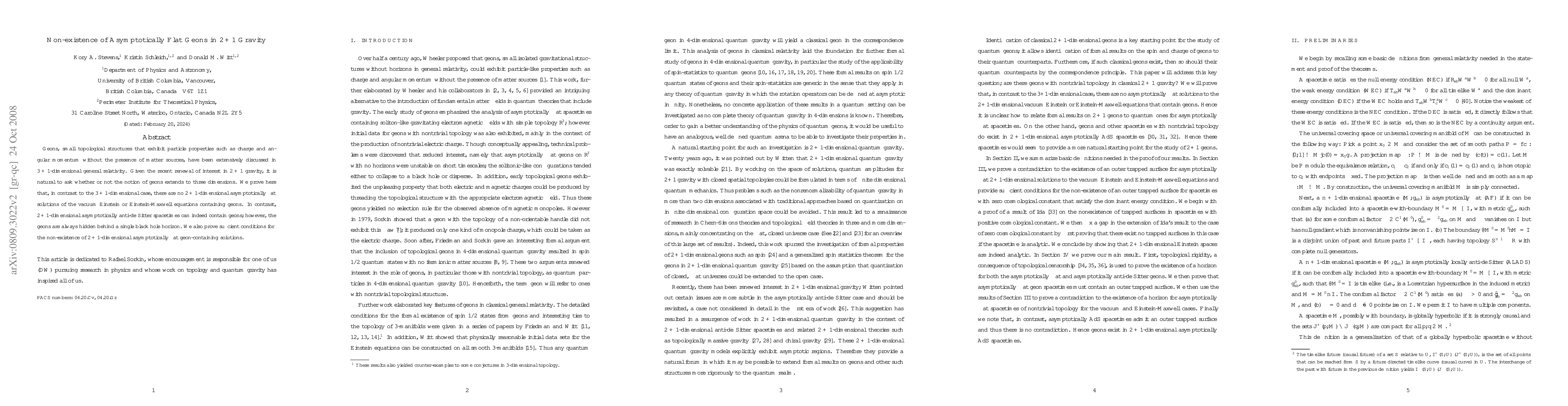 This paper proves that 2+1-dimensional asymptotically flat geon solutions do not exist in vacuum Einstein or Einstein-Maxwell equations, unlike their 3+1-dimensional counterparts. In contrast, 2+1-dimensional asymptotically anti-de Sitter spacetimes can contain geons, but they are always concealed behind a black hole horizon.