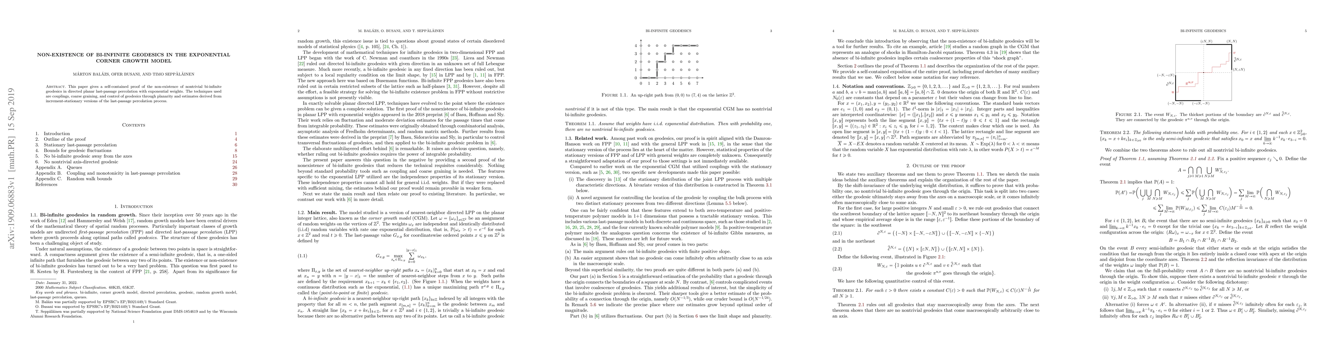 This paper proves the non-existence of nontrivial bi-infinite geodesics in the exponential corner growth model using couplings, coarse graining, and planarity-based estimates. The techniques involve controlling geodesics through increment-stationary versions of the last-passage percolation process.