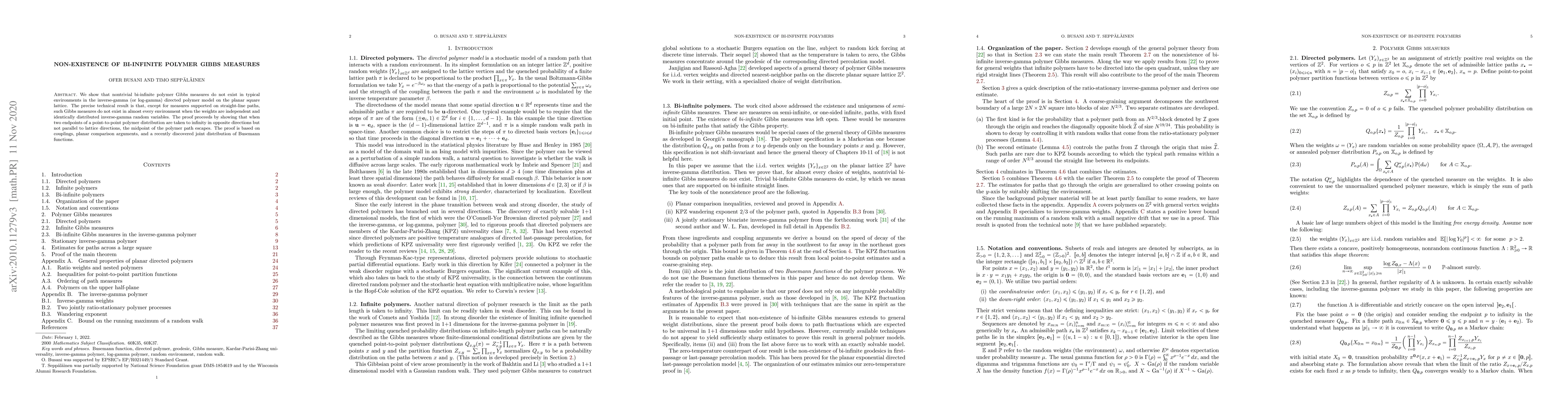 We show that nontrivial bi-infinite polymer Gibbs measures do not exist in typical environments in the inverse-gamma (or log-gamma) directed polymer model on the planar square lattice. The precise technical result is that, except for measures supported on straight-line paths, such Gibbs measures do not exist in almost every environment when the weights are independent and identically distributed inverse-gamma random variables. The proof proceeds by showing that when two endpoints of a point-to-point polymer distribution are taken to infinity in opposite directions but not parallel to lattice directions, the midpoint of the polymer path escapes. The proof is based on couplings, planar comparison arguments, and a recently discovered joint distribution of Busemann functions.