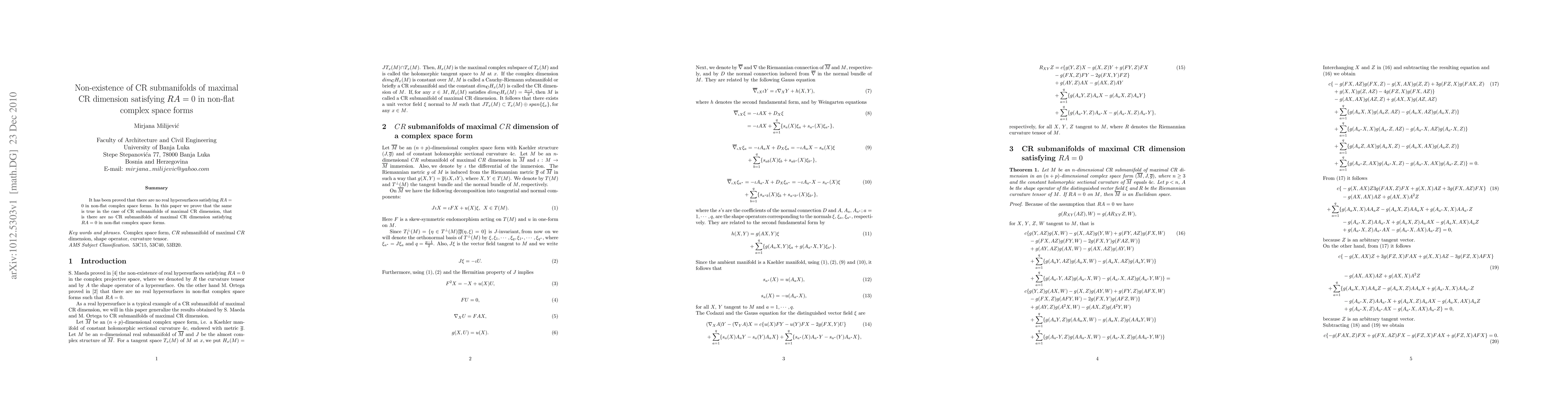 This paper proves the non-existence of CR submanifolds of maximal CR dimension that satisfy RA = 0 in non-flat complex space forms, extending the result previously established for real hypersurfaces.