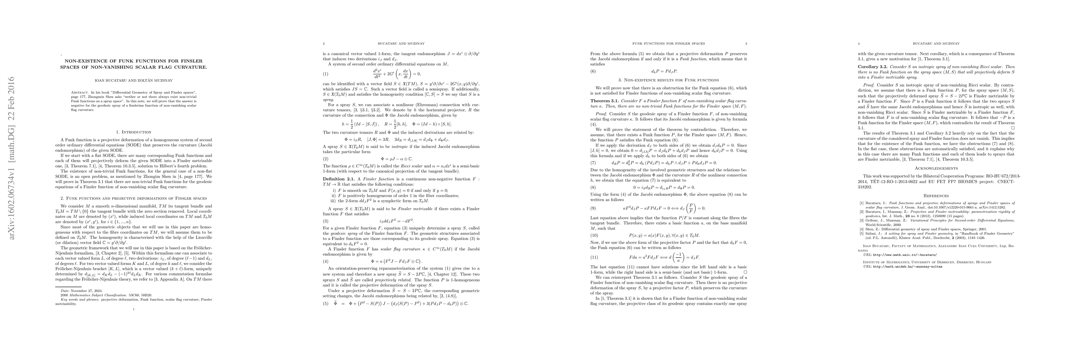Summary: This research disproves the existence of non-trivial Funk functions in Finsler spaces with non-vanishing scalar flag curvature, specifically for the geodesic spray of such functions, addressing a question posed by Zhongmin Shen.