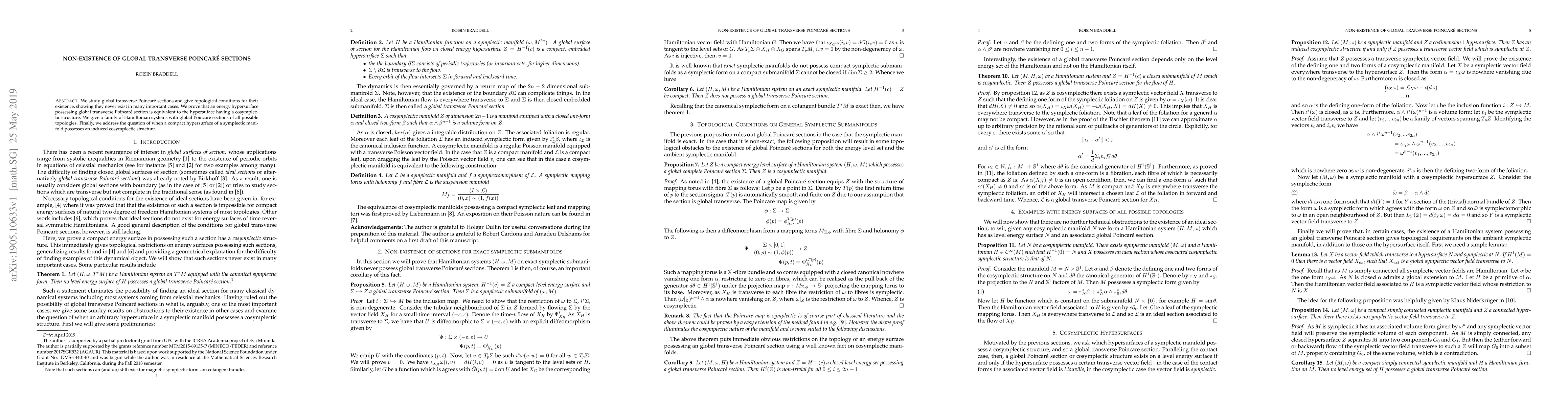 This paper demonstrates that global transverse Poincaré sections do not exist in many significant cases and proves their equivalence to cosymplectic structures on energy hypersurfaces. It also presents Hamiltonian systems with Poincaré sections of various topologies and explores conditions for cosymplectic structures on compact hypersurfaces within symplectic manifolds.