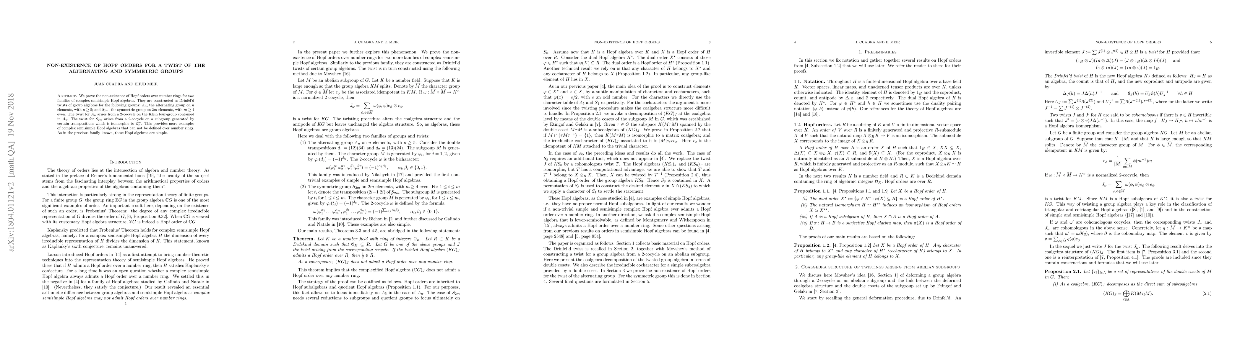 This paper demonstrates the non-existence of Hopf orders for complex semisimple Hopf algebras derived from Drinfel'd twists of group algebras for alternating groups $A_n$ (with $n \geq 5$) and symmetric groups $S_{2m}$ (with $m \geq 4$ even). These results add to the growing list of simple Hopf algebras that cannot be defined over number rings.