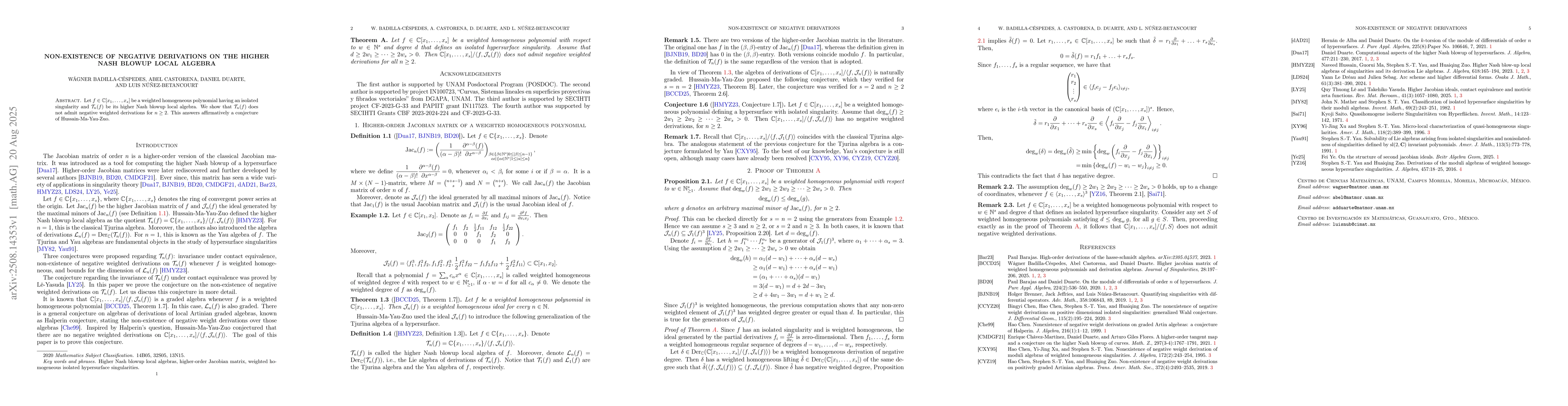 The paper establishes a proof for the non-existence of negative weighted derivations on higher Nash blowup local algebras, extending previous results for n = 1.