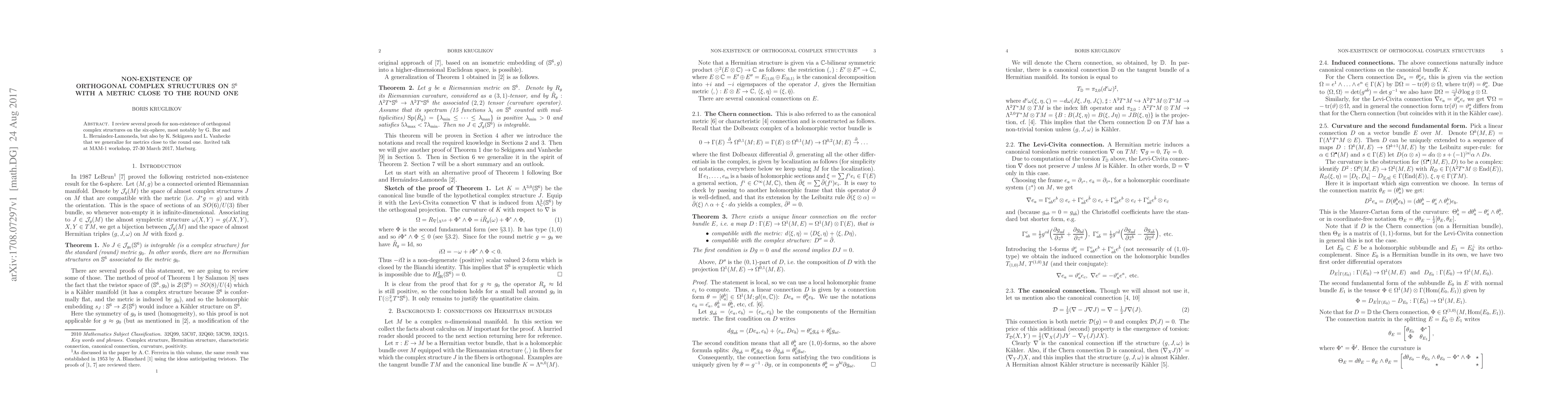 I review several proofs for non-existence of orthogonal complex structures on the six-sphere, most notably by G. Bor and L. Hernandez-Lamoneda, but also by K. Sekigawa and L. Vanhecke that we generalize for metrics close to the round one. Invited talk at MAM-1 workshop, 27-30 March 2017, Marburg.