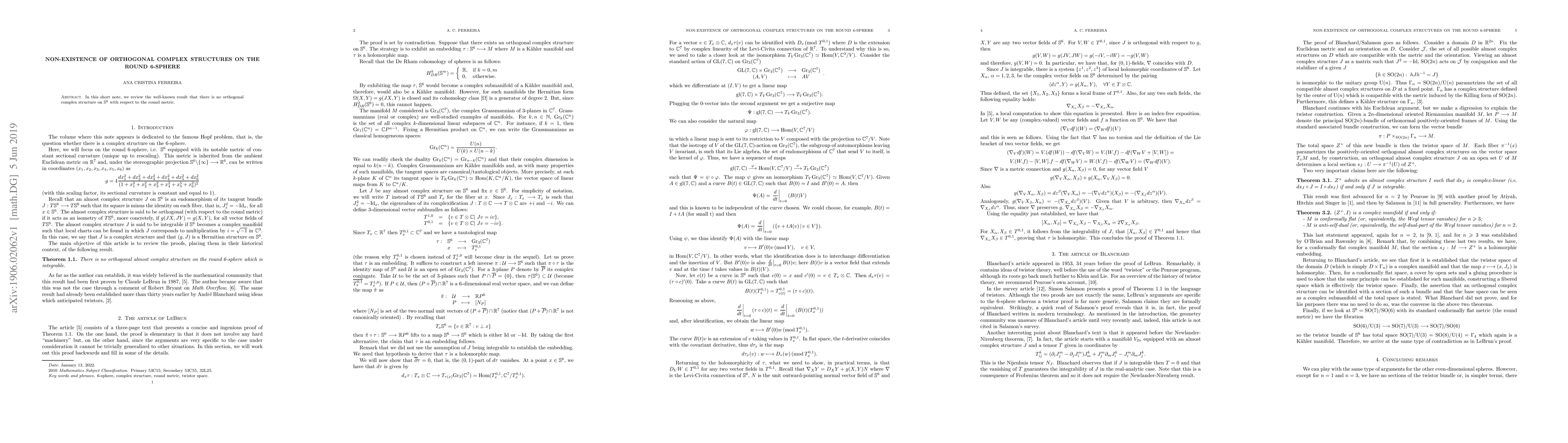Summary: This paper confirms the non-existence of an orthogonal complex structure on the round 6-sphere, reaffirming a well-established result in differential geometry. The focus remains on the intrinsic geometric properties of the 6-sphere under the round metric.