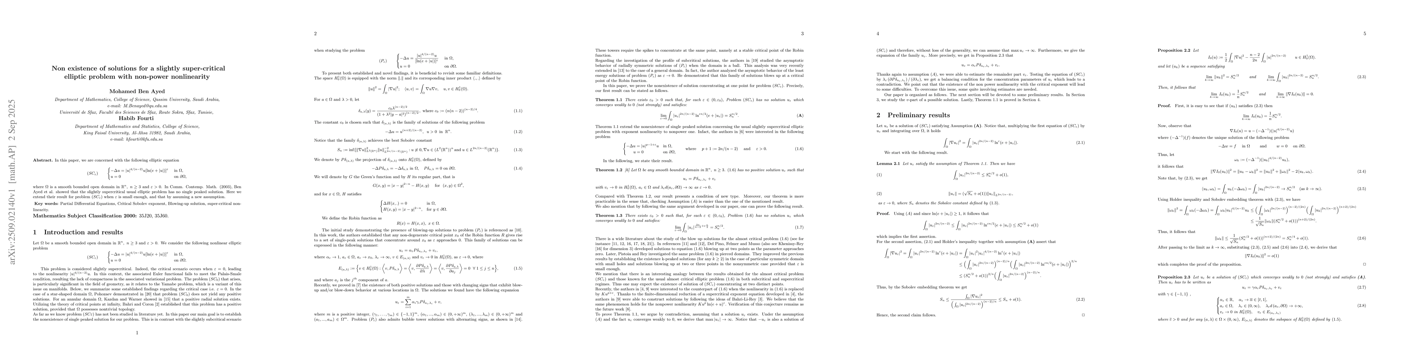 In this paper, we are concerned with the following elliptic equation $$ ( SC_\varepsilon ) \qquad \begin{cases} -\Delta u = |u|^{4/(n-2)}u [\ln (e+|u|)]^\varepsilon & \hbox{ in } \Omega,\\ u = 0 & \hbox{ on }\partial \Omega, \end{cases} $$ where $\Omega $ is a smooth bounded open domain in $\mathbb{R}^n, \ n\geq 3$ and $\varepsilon >0$. In Comm. Contemp. Math. (2003), Ben Ayed et al. showed that the slightly supercritical usual elliptic problem has no single peaked solution. Here we extend their result for problem $( SC_\varepsilon )$ when $\varepsilon$ is small enough, and that by assuming a new assumption.