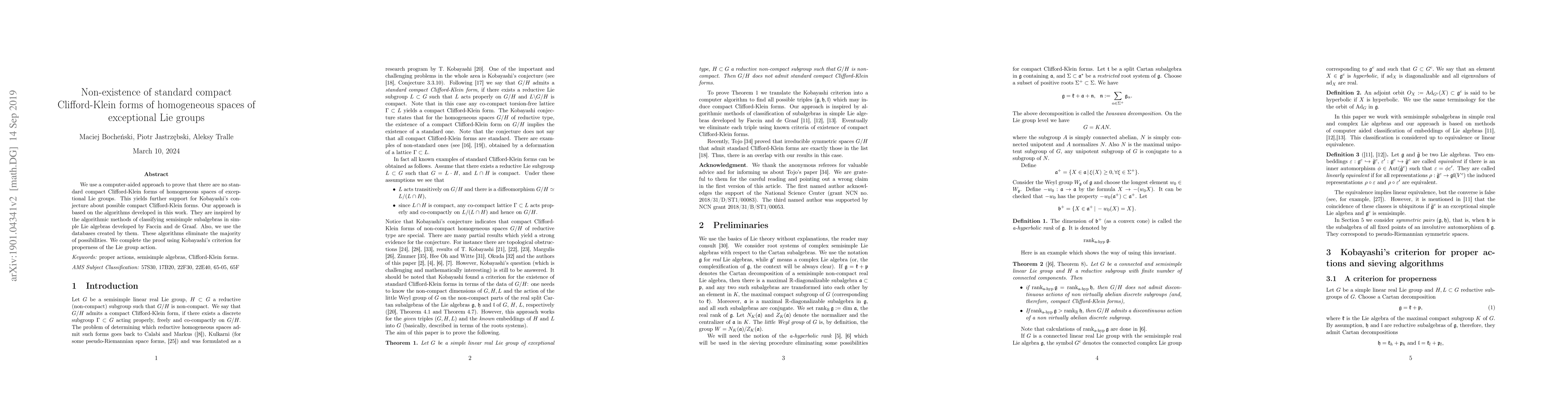 Summary: This research uses computer-aided methods to demonstrate the non-existence of standard compact Clifford-Klein forms for homogeneous spaces of exceptional Lie groups, providing further evidence for Kobayashi's conjecture. The proof employs newly developed algorithms and utilizes existing methods for classifying semisimple subalgebras and calculating invariants.