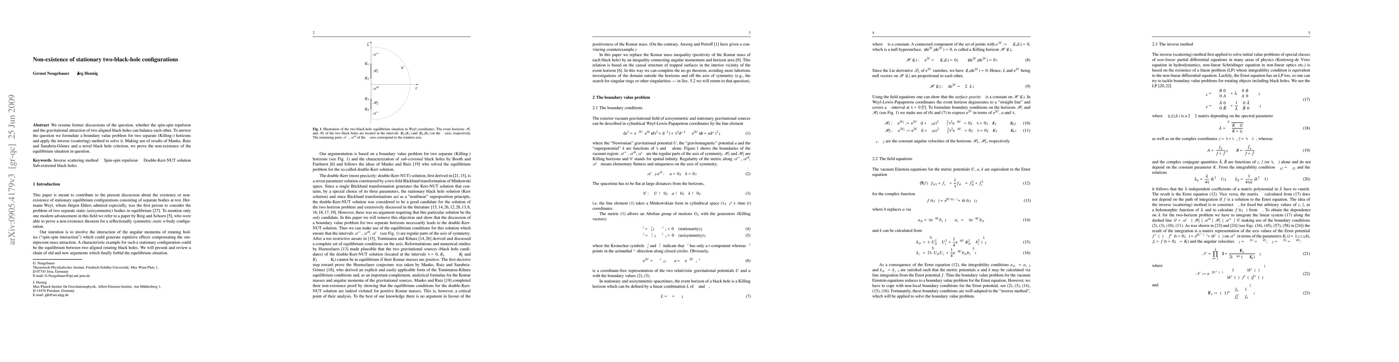 We resume former discussions of the question, whether the spin-spin repulsion and the gravitational attraction of two aligned black holes can balance each other. To answer the question we formulate a boundary value problem for two separate (Killing-) horizons and apply the inverse (scattering) method to solve it. Making use of results of Manko, Ruiz and Sanabria-G\'omez and a novel black hole criterion, we prove the non-existence of the equilibrium situation in question.