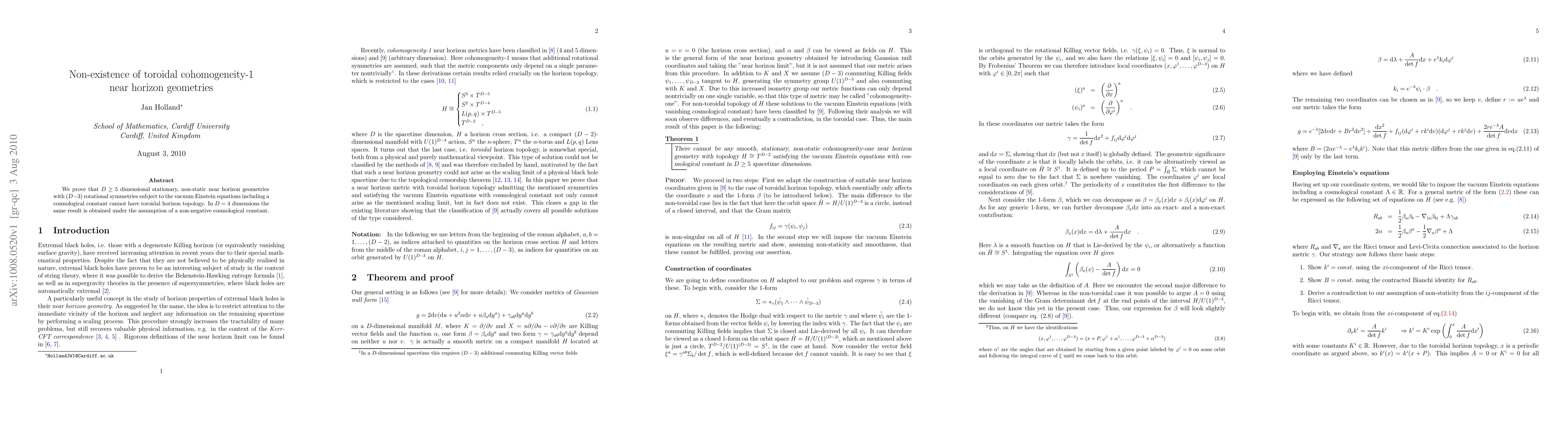 We prove that $D\geq 5$ dimensional stationary, non-static near horizon geometries with (D-3) rotational symmetries subject to the vacuum Einstein equations including a cosmological constant cannot have toroidal horizon topology. In D=4 dimensions the same result is obtained under the assumption of a non-negative cosmological constant.