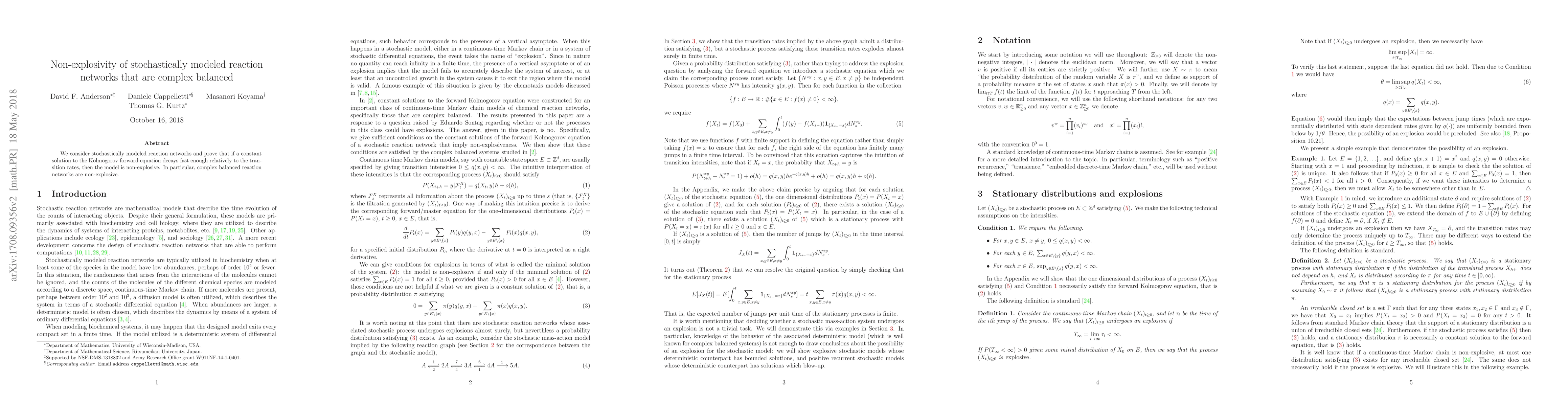 Summary: This paper proves that stochastically modeled reaction networks that are complex balanced are non-explosive, provided that the constant solution to the Kolmogorov forward equation decays sufficiently fast relative to the transition rates. Complex balanced networks thus exhibit stable, non-explosive behavior.