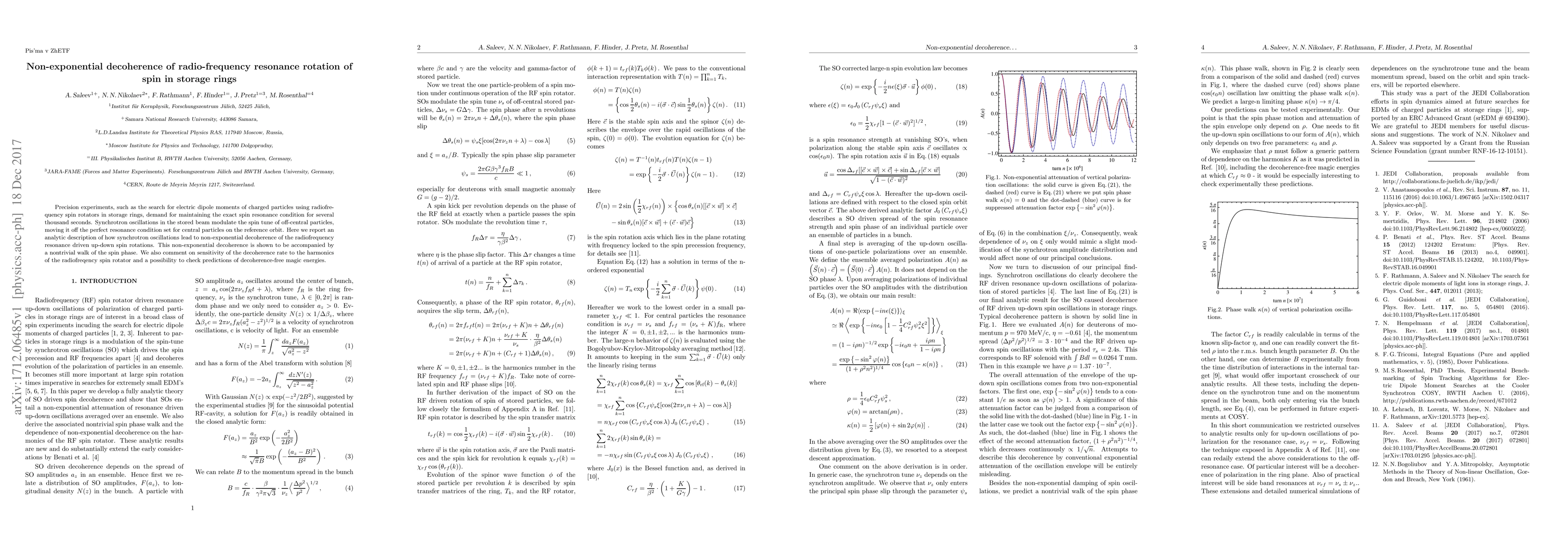 The paper presents an advanced analytical theory of synchrotron oscillation-driven spin decoherence, including a nontrivial spin phase walk, and its dependence on radiofrequency spin rotator harmonics.