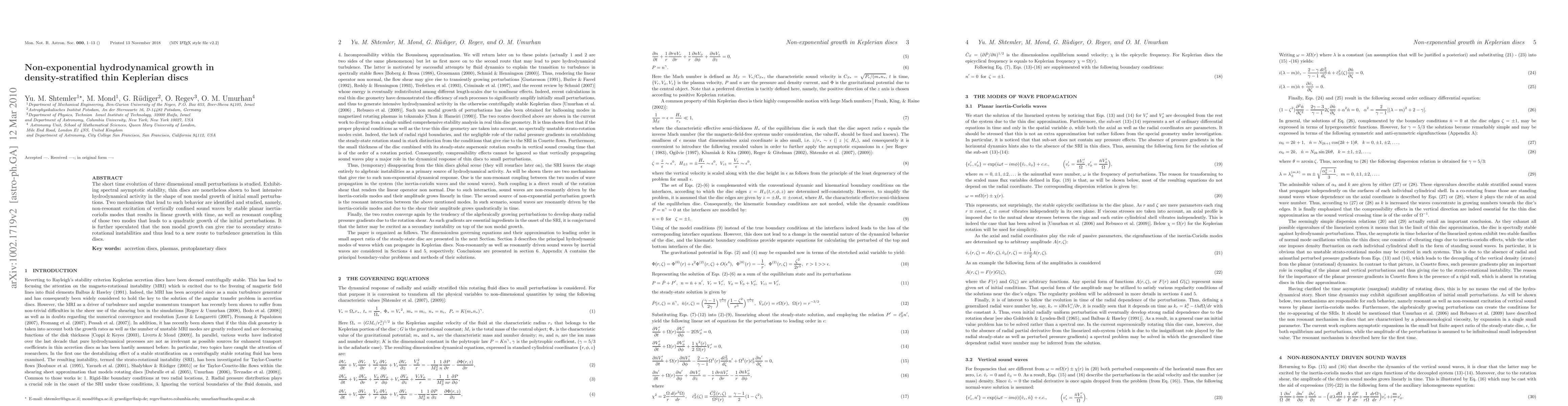 This paper investigates the short-term evolution of small perturbations in density-stratified thin Keplerian discs, revealing non-exponential hydrodynamical growth through non-modal mechanisms. It identifies two processes: non-resonant excitation and resonant coupling of sound waves and planar modes, leading to linear and quadratic growth respectively, and speculates on their potential to generate secondary instabilities and turbulence.