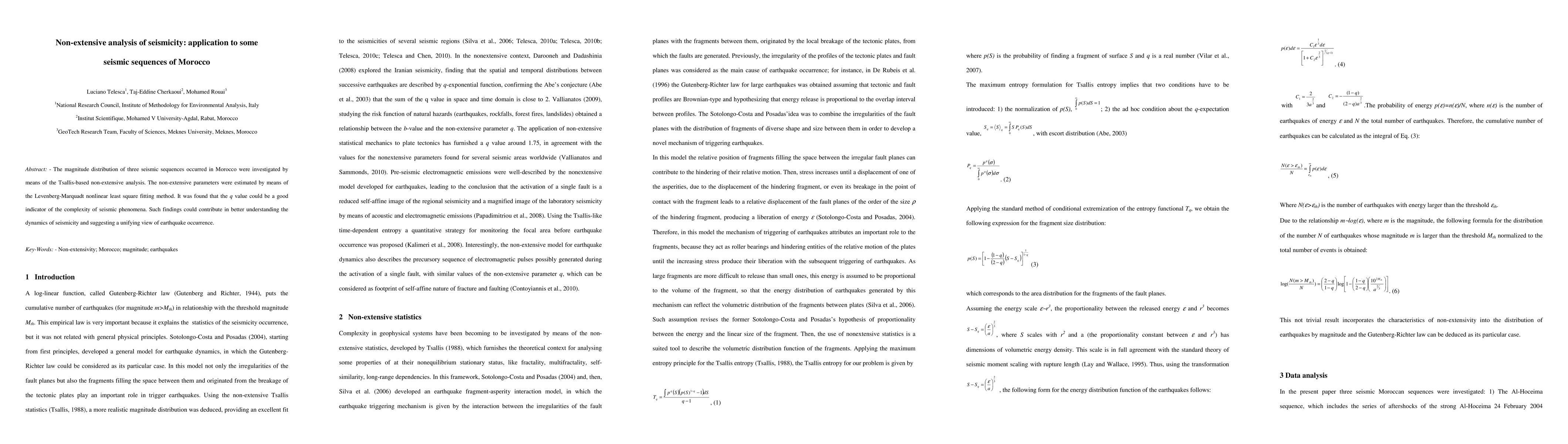 The magnitude distribution of three seismic sequences occurred in Morocco were investigated by means of the Tsallis-based non-extensive analysis. The non-extensive parameters were estimated by means of the Levenberg-Marquadt nonlinear least square fitting method. It was found that the q value could be a good indicator of the complexity of seismic phenomena. Such findings could contribute in better understanding the dynamics of seismicity and suggesting a unifying view of earthquake occurrence.