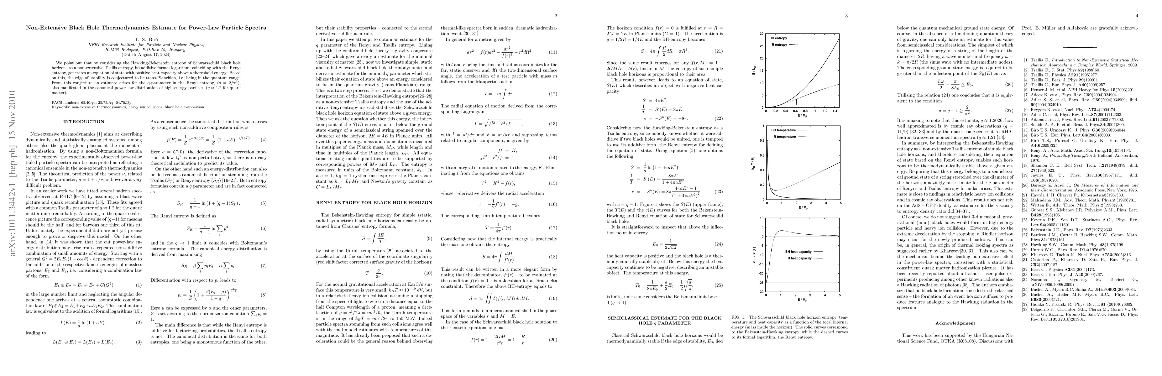 This paper proposes a non-extensive Tsallis entropy approach to Schwarzschild black hole thermodynamics, suggesting a positive heat capacity above a threshold energy and a trans-Planckian edge of stability. It estimates the q-parameter in Renyi entropy to be around 2/π², correlating with power-law particle spectra in high energy environments.