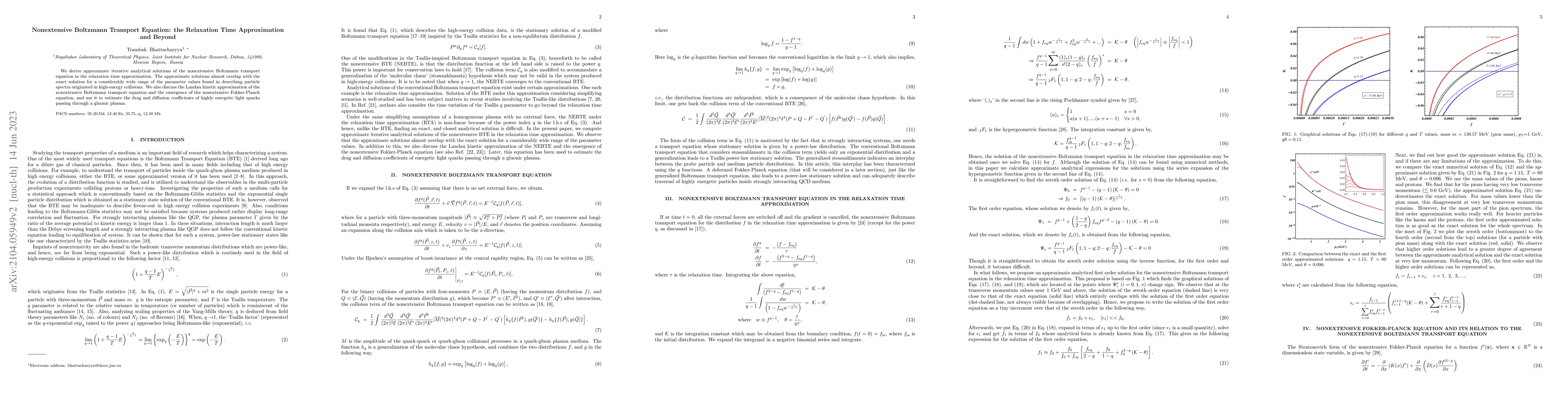 This paper derives approximate analytical solutions for the non-extensive Boltzmann transport equation under the relaxation time approximation, showing they closely match exact solutions over a broad parameter range. It also explores the Landau kinetic approximation and the non-extensive Fokker-Planck equation to estimate drag and diffusion coefficients for energetic quarks in a gluonic plasma.