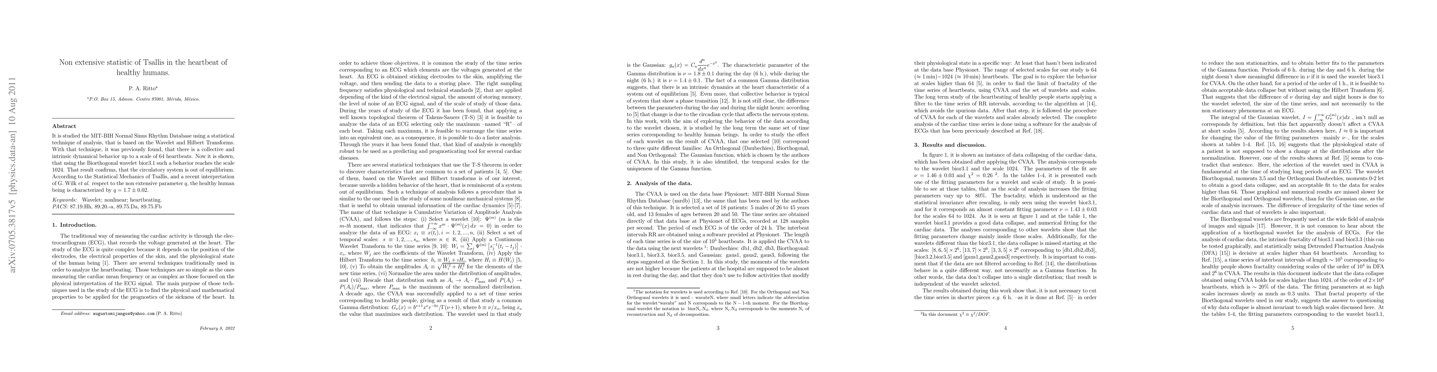 It is studied the MIT-BIH Normal Sinus Rhythm Database using a statistical technique of analysis, that is based on the Wavelet and Hilbert Transforms. With that technique, it was previously found, that there is a collective and intrinsic dynamical behavior up to a scale of 64 heartbeats. Now it is shown, that using the Biorthogonal wavelet bior3.1 such a behavior reaches the scale 1024. That result confirms, that the circulatory system is out of equilibrium. According to the Statistical Mechanics of Tsallis, and a recent interpretation of G. Wilk et al. respect to the non extensive parameter q, the healthy human being is characterized by q=1.70+/-0.01.