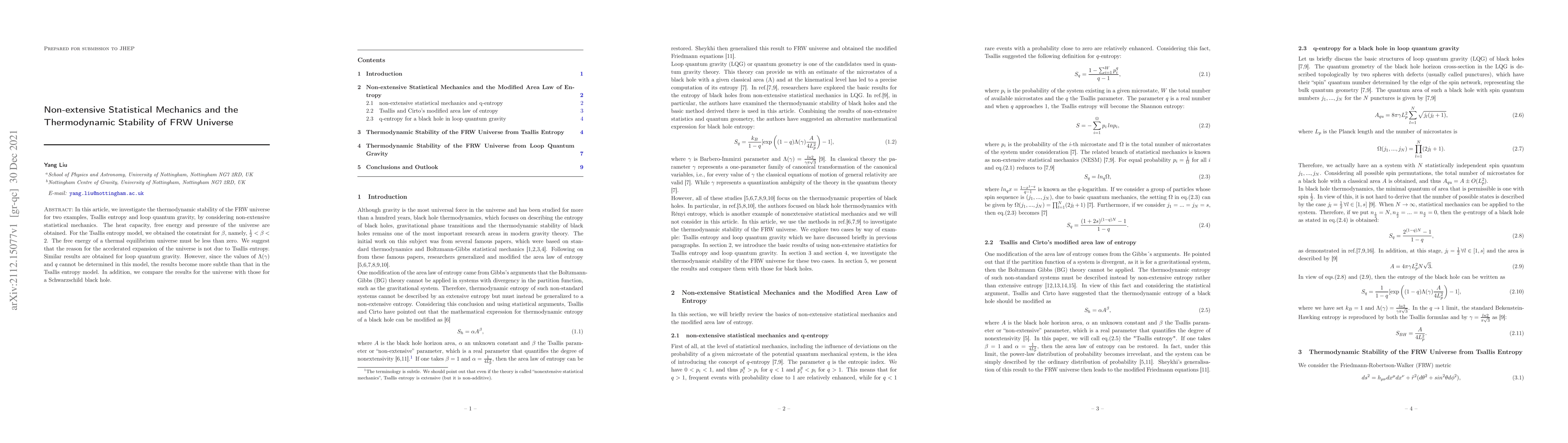 This paper explores the thermodynamic stability of the Friedmann-Robertson-Walker (FRW) universe using non-extensive statistical mechanics, specifically for Tsallis entropy and loop quantum gravity models. The study finds that while both models provide insights, the accelerated expansion of the universe is not attributed to Tsallis entropy.