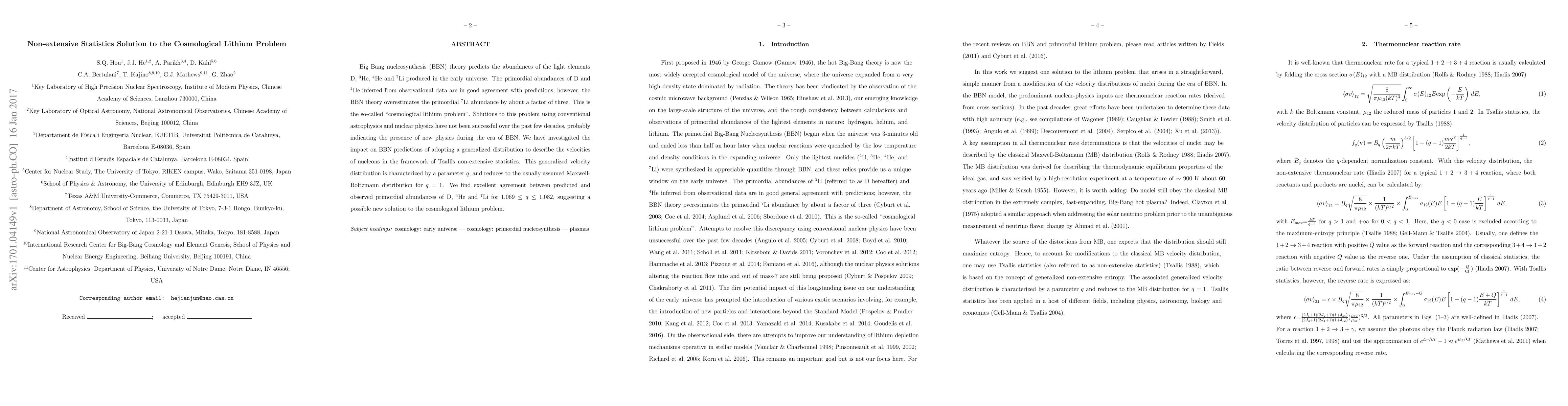 This paper proposes a solution to the "cosmological lithium problem" by using Tsallis non-extensive statistics to describe nucleon velocities during Big Bang nucleosynthesis, achieving better agreement between predicted and observed primordial abundances of D, $^4$He, and $^7$Li.