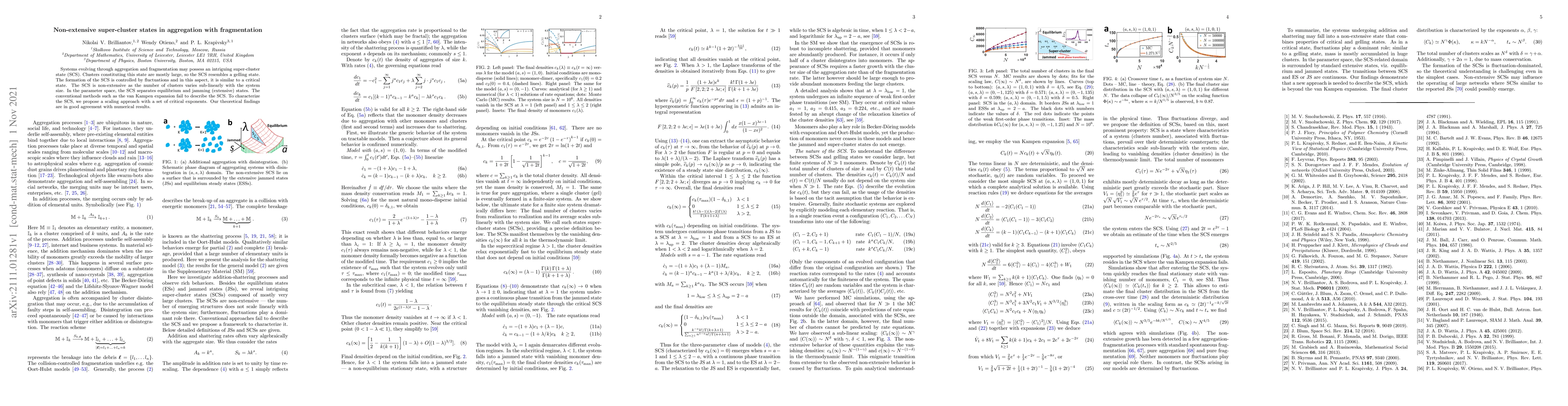 Systems evolving through aggregation and fragmentation may possess an intriguing super-cluster state (SCS). Clusters constituting this state are mostly large, so the SCS resembles a gelling state. The formation of the SCS is controlled by fluctuations and in this aspect, it is similar to a critical state. The SCS is non-extensive as the number of clusters varies sub-linearly with the system size. In the parameter space, the SCS separates equilibrium and jamming (extensive) states. The conventional methods such as the van Kampen expansion fail to describe the SCS. To characterize the SCS, we propose a scaling approach with a set of critical exponents. Our theoretical findings are in good agreement with numerical results.