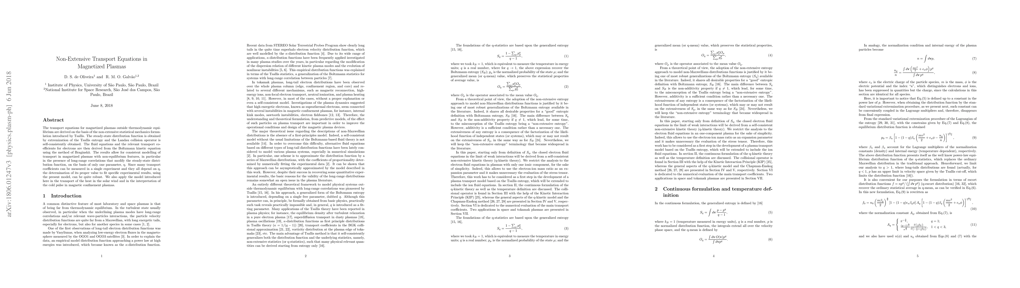 This paper introduces a self-consistent kinetic model for collisional transport in magnetized plasmas based on nonextensive statistics, deriving solutions for electrons and calculating transport coefficients. The model is applied to study heat transport in space plasmas and the cold pulse phenomenon in magnetic confined plasmas.