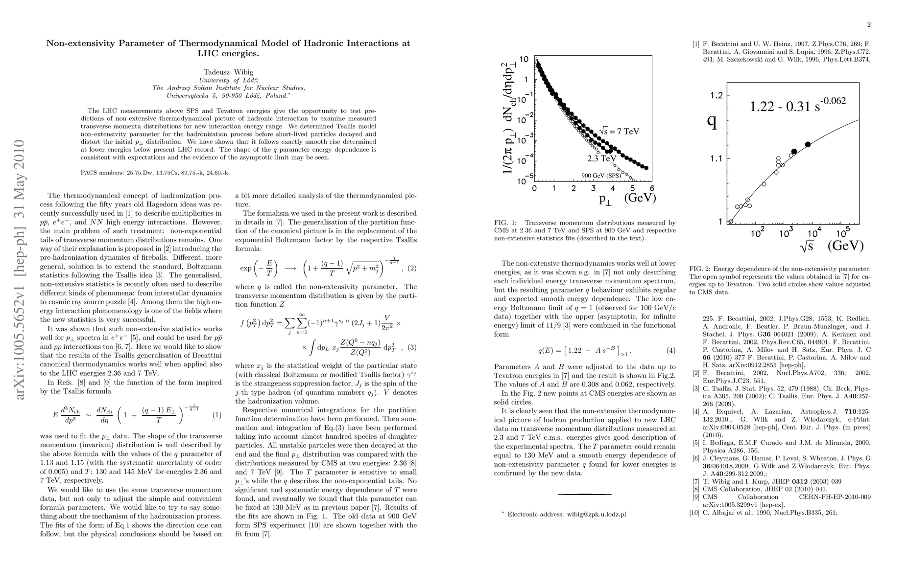 The LHC measurements above SPS and Tevatron energies give the opportunity to test predictions of non-extensive thermodynamical picture of hadronic interaction to examine measured transverse momenta distributions for new interaction energy range. We determined Tsallis model non-extensivity parameter for the hadronization process before short-lived particles decayed and distort the initial p_t distribution. We have shown that it follows exactly smooth rise determined at lower energies below present LHC record. The shape of the q parameter energy dependence is consistent with expectations and the evidence of the asymptotic limit may be seen.