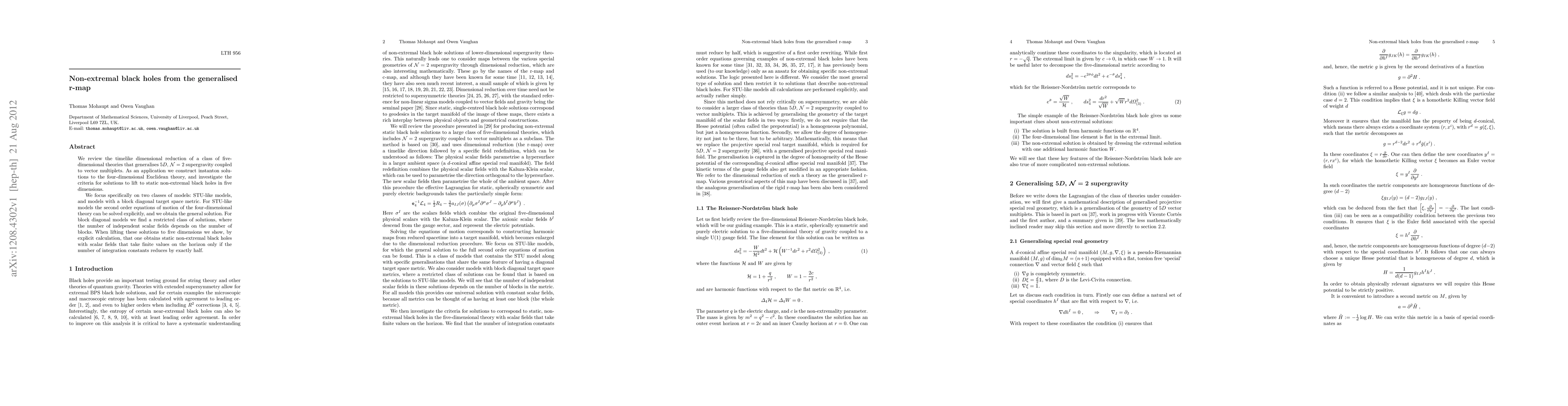 We review the timelike dimensional reduction of a class of five-dimensional theories that generalises 5D, N = 2 supergravity coupled to vector multiplets. As an application we construct instanton solutions to the four-dimensional Euclidean theory, and investigate the criteria for solutions to lift to static non-extremal black holes in five dimensions. We focus specifically on two classes of models: STU-like models, and models with a block diagonal target space metric. For STU-like models the second order equations of motion of the four-dimensional theory can be solved explicitly, and we obtain the general solution. For block diagonal models we find a restricted class of solutions, where the number of independent scalar fields depends on the number of blocks. When lifting these solutions to five dimensions we show, by explicit calculation, that one obtains static non-extremal black holes with scalar fields that take finite values on the horizon only if the number of integration constants reduces by exactly half.