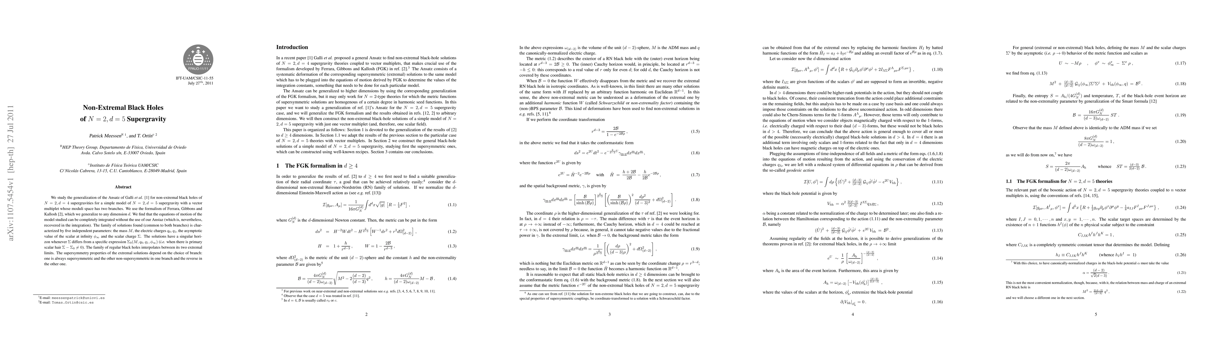 This paper generalizes the Ansatz for non-extremal black holes in N=2,d=5 supergravity, finding complete integrability of the model's equations of motion. The solutions, characterized by five independent parameters, interpolate between two extremal limits with differing supersymmetry properties.