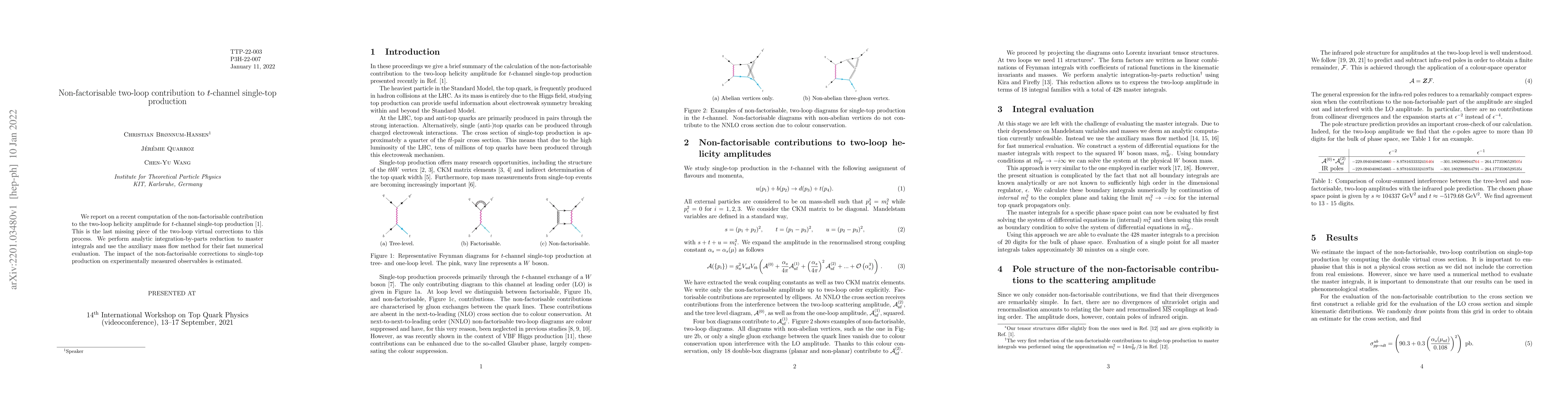 We report on a recent computation of the non-factorisable contribution to the two-loop helicity amplitude for $t$-channel single-top production arXiv:2108.09222. This is the last missing piece of the two-loop virtual corrections to this process. We perform analytic integration-by-parts reduction to master integrals and use the auxiliary mass flow method for their fast numerical evaluation. The impact of the non-factorisable corrections to single-top production on experimentally measured observables is estimated.