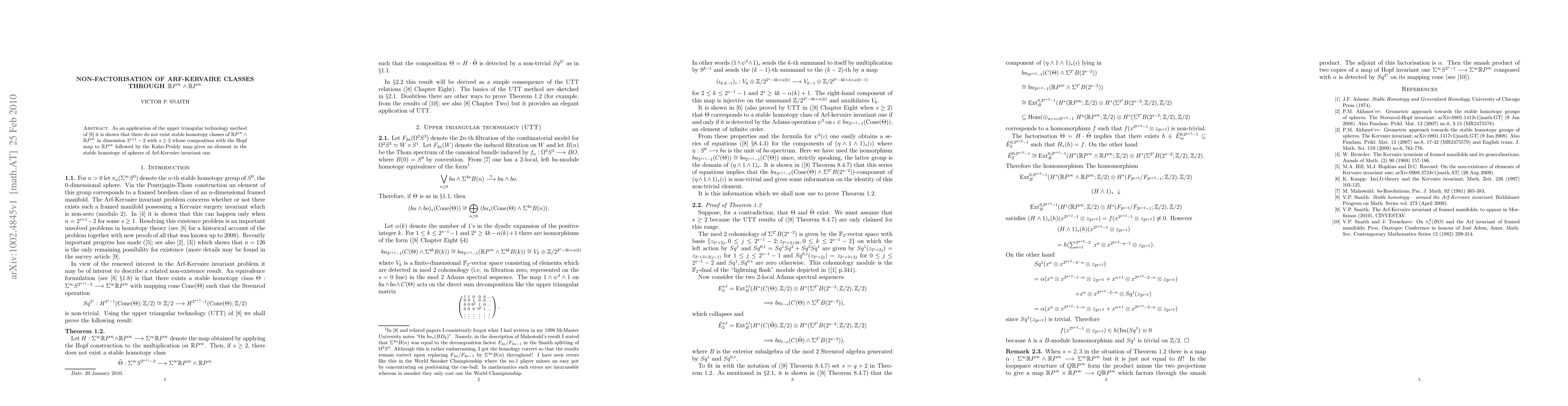 This paper demonstrates, using Snaith's upper triangular technology, that there are no stable homotopy classes in the specified dimension of ${\mathbb RP}^{\infty} \wedge {\mathbb RP}^{\infty}$ that compose with the Hopf map and Kahn-Priddy map to yield an element of the Arf-Kervaire class in stable homotopy of spheres. This result negates the factorization of Arf-Kervaire classes through this composition.