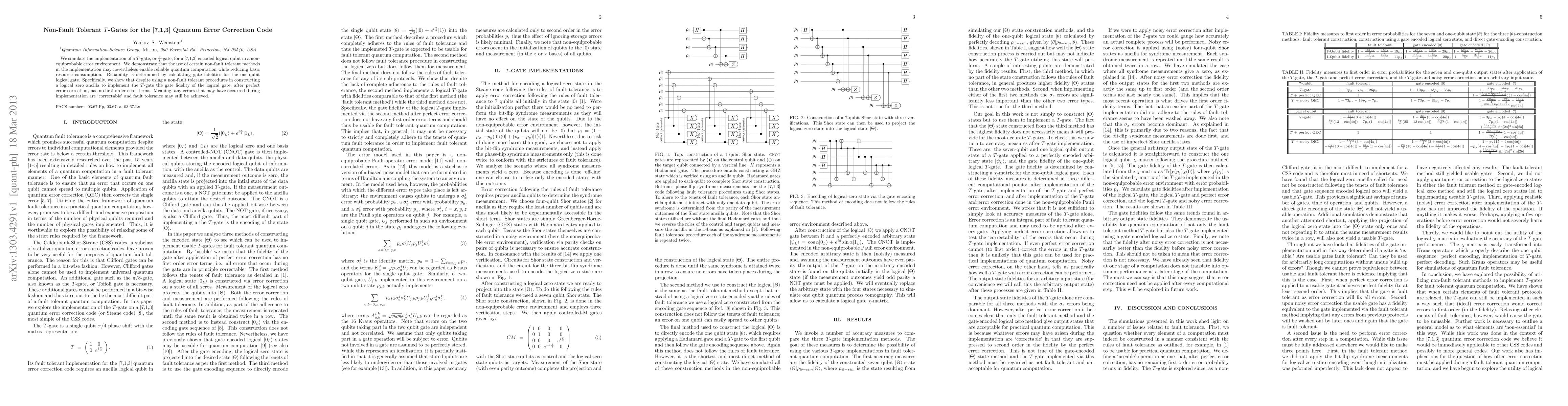 This paper investigates the implementation of T-gates in a [7,1,3] quantum error correction code using non-fault tolerant methods, demonstrating that these methods can still enable reliable quantum computation with reduced resource consumption. The study shows that despite non-fault tolerant procedures, the gate fidelity remains high, indicating that errors are correctable, thus achieving fault tolerance.
