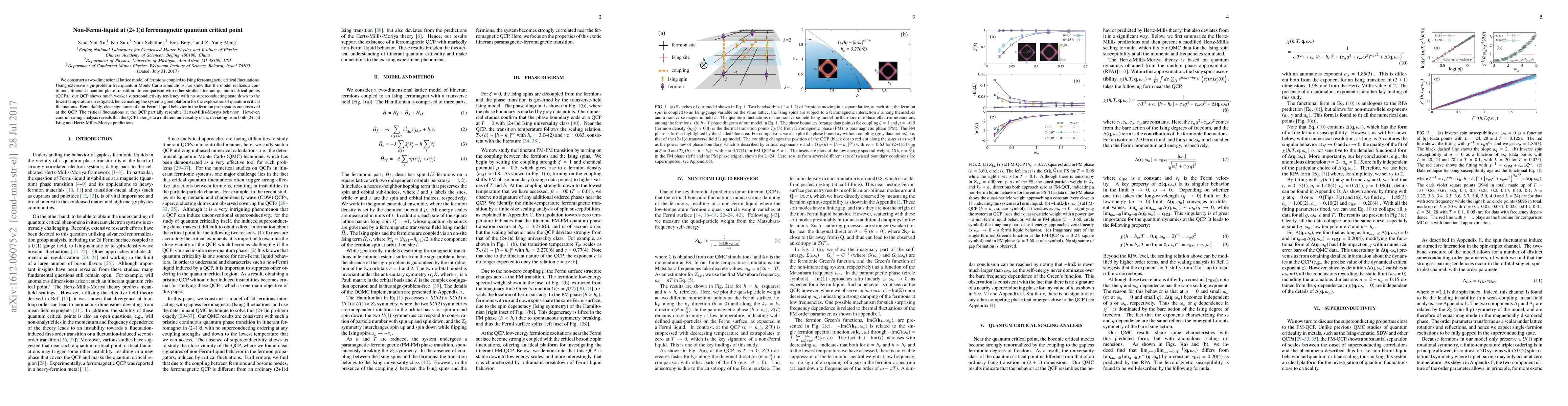 This research constructs a 2D lattice model of fermions interacting with Ising ferromagnetic fluctuations, revealing a non-Fermi-liquid state at the quantum critical point. The study shows weak superconductivity tendencies and identifies a new universality class for the critical fluctuations, distinct from existing predictions.