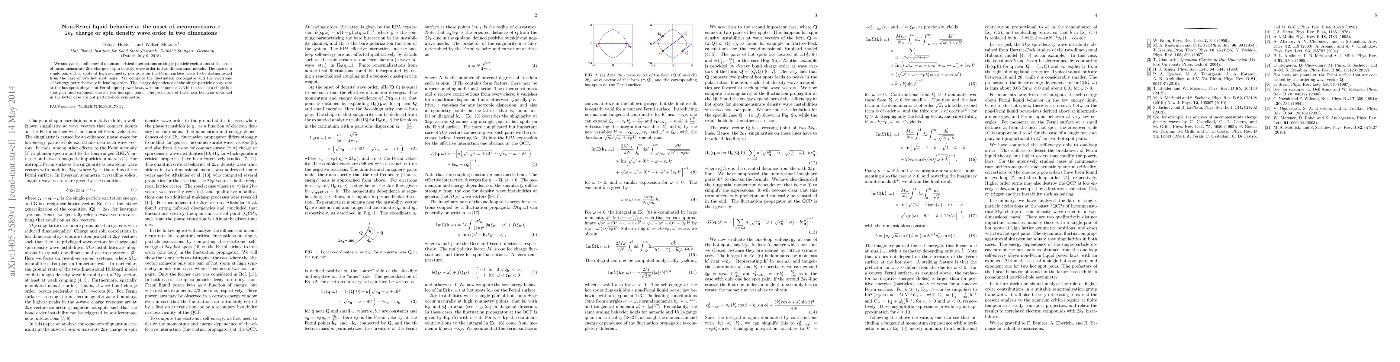 Research investigates non-Fermi liquid behavior at onset of incommensurate charge/spin density wave order in 2D metals, finding single-particle decay rates obey power laws with different exponents for one vs two hot spot pairs.