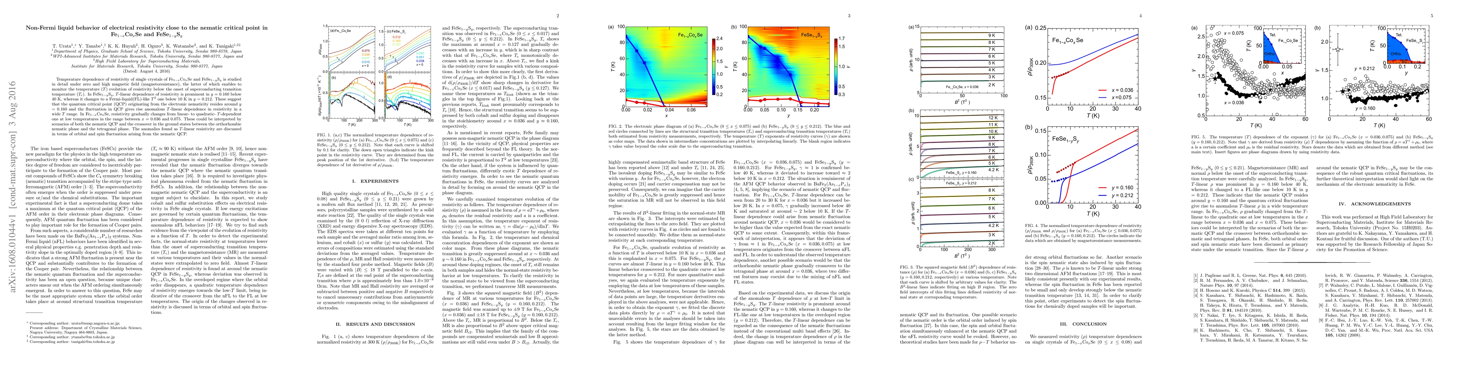 This study investigates the temperature dependence of resistivity in Fe$_{1-x}$Co$_x$Se and FeSe$_{1-y}$S$_y$ single crystals, revealing non-Fermi liquid behavior near the nematic critical point. In FeSe$_{1-y}$S$_y$, a $T$-linear resistivity is observed below 40 K, suggesting a quantum critical point linked to electronic nematicity, while in Fe$_{1-x}$Co$_x$Se, resistivity transitions from linear to quadratic dependence, indicating a crossover between nematic and tetragonal phases.