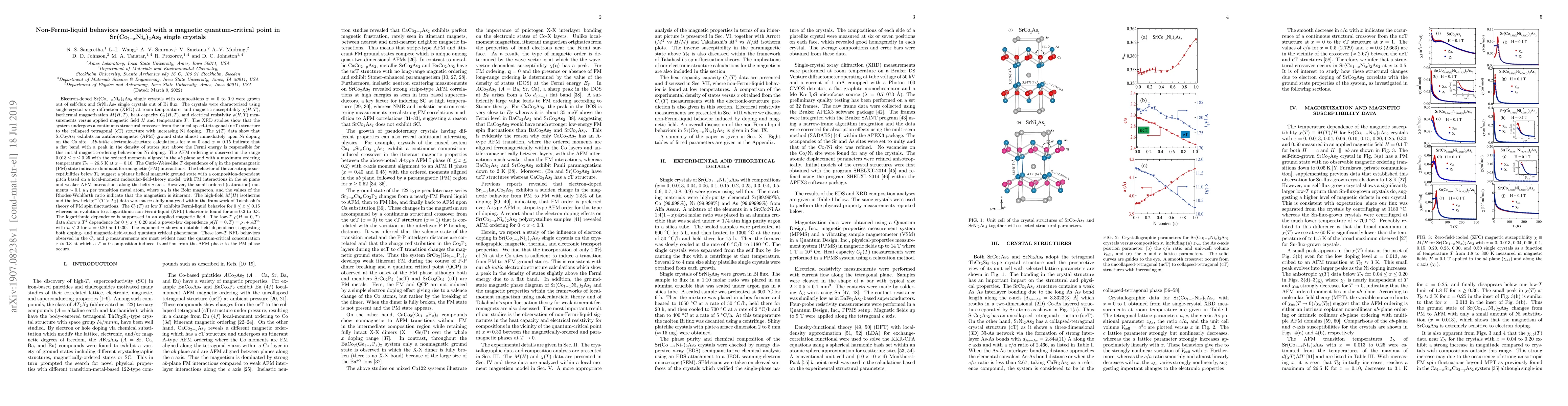 This study investigates electron-doped Sr(Co{1-x}Ni{x})2As2 single crystals, revealing non-Fermi-liquid behaviors near a magnetic quantum-critical point. The research shows a transition from Fermi-liquid to logarithmic non-Fermi-liquid behavior in heat capacity and resistivity as Ni doping increases, particularly evident around x = 0.3.
